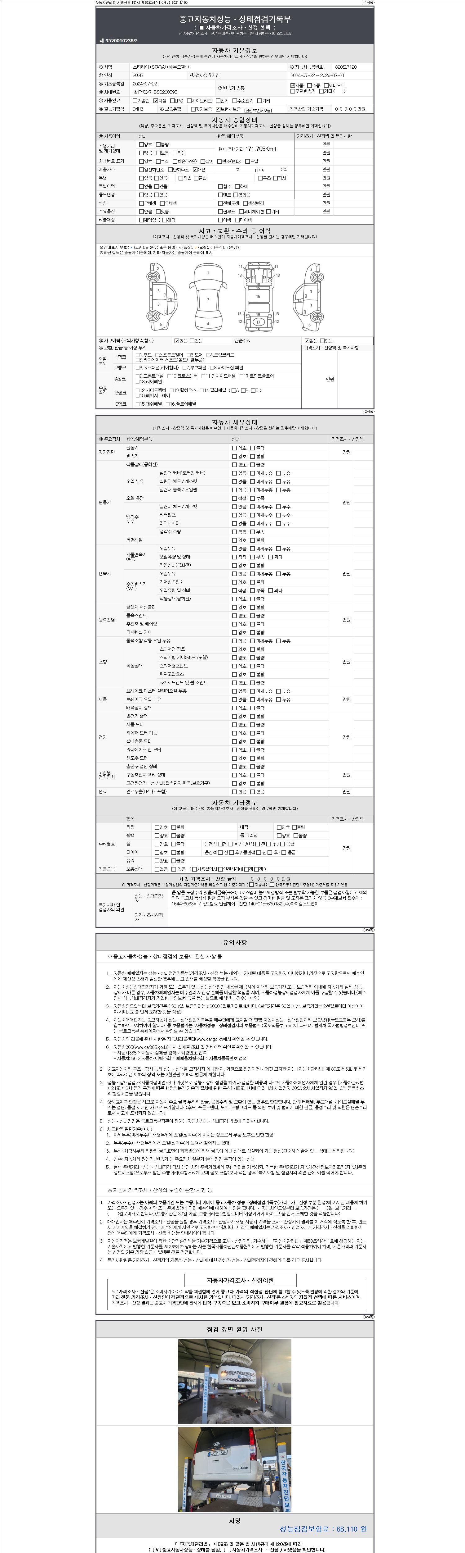 자동차관리법 시행규칙 제120조의 규정에 따라 별지 제 82호서식 《중고자동차 성능, 상태점검 기록부》를 발행한 성능, 상태점검자 및 매매자는 아래의 보증기간 또는 보증거리 이내의 중고자동차, 성능점검 기록부에 기재된 내용과 자동차의 실제 성능, 상태가 다른 경우 계약 또는 관계법령에 따라 매수인에 대하여 책임을 집니다.