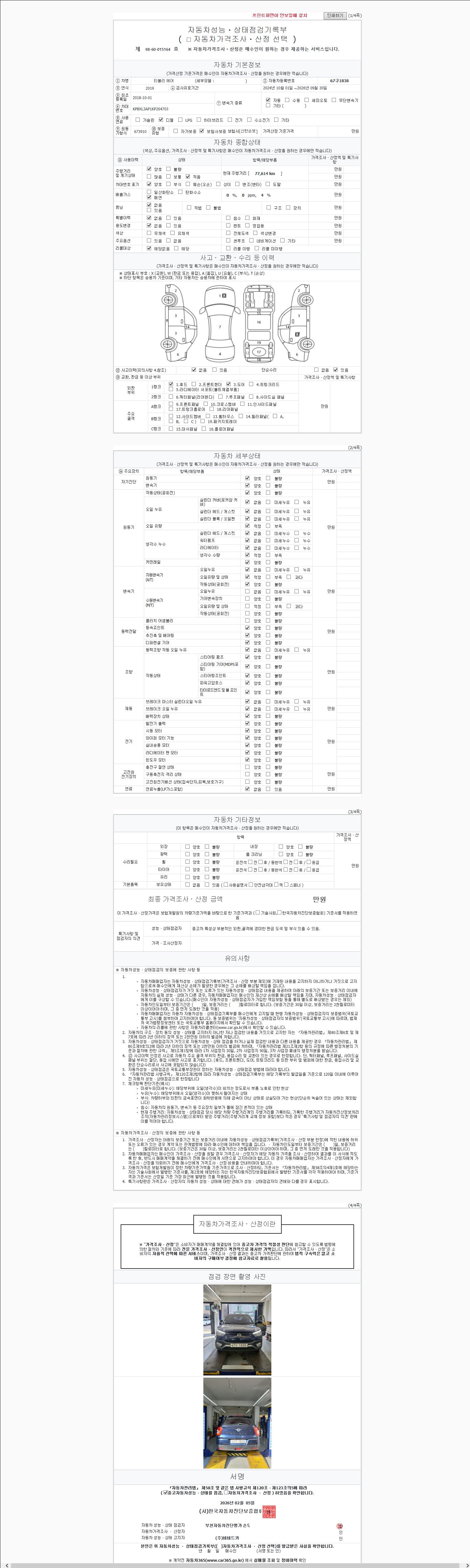 | 주행거리 | 77,614 km | 차량번호 | 67구1838 | 사고유무 | 성능기록부 참조 | 제시번호 | 제 2026051867 호 |
