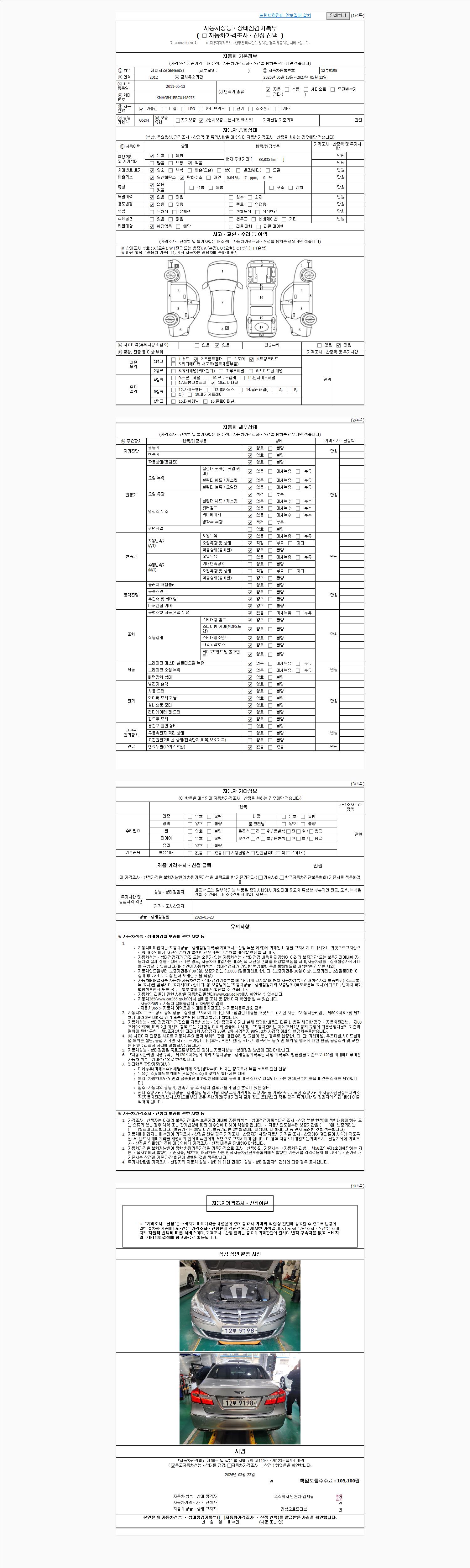 | 주행거리 | 88,835 km | 차량번호 | 12부9198 | 사고유무 | 성능기록부 참조 | 제시번호 | 제 2026014893 호 |