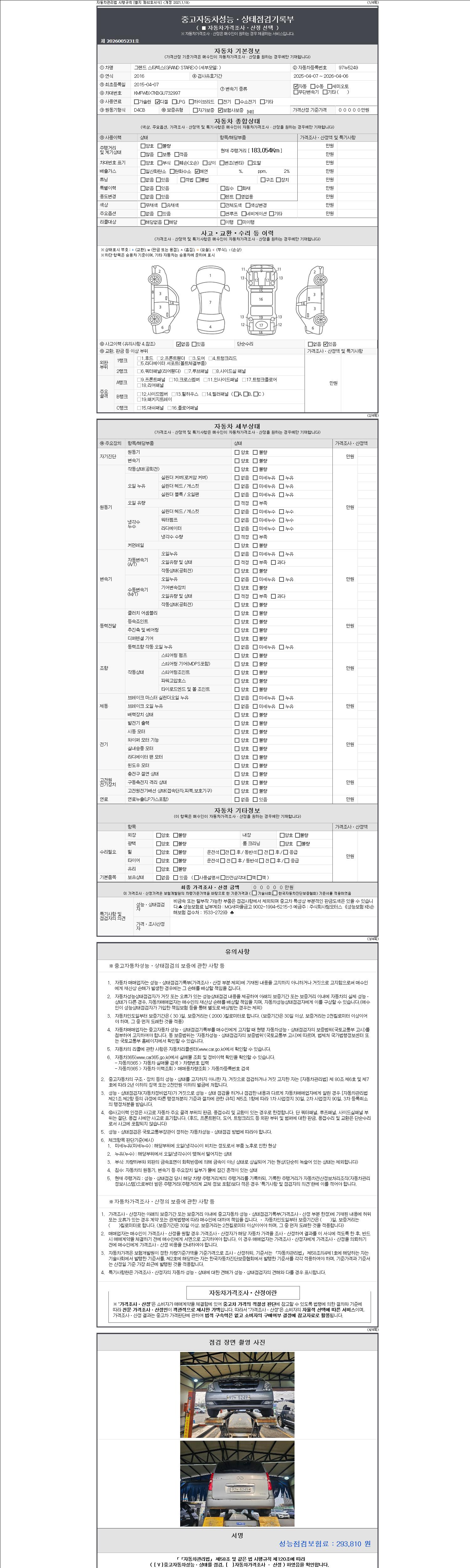 | 주행거리 | 183,054 km | 차량번호 | 97누5249 | 사고유무 | 성능기록부 참조 | 제시번호 | 제 2147483647 호 |