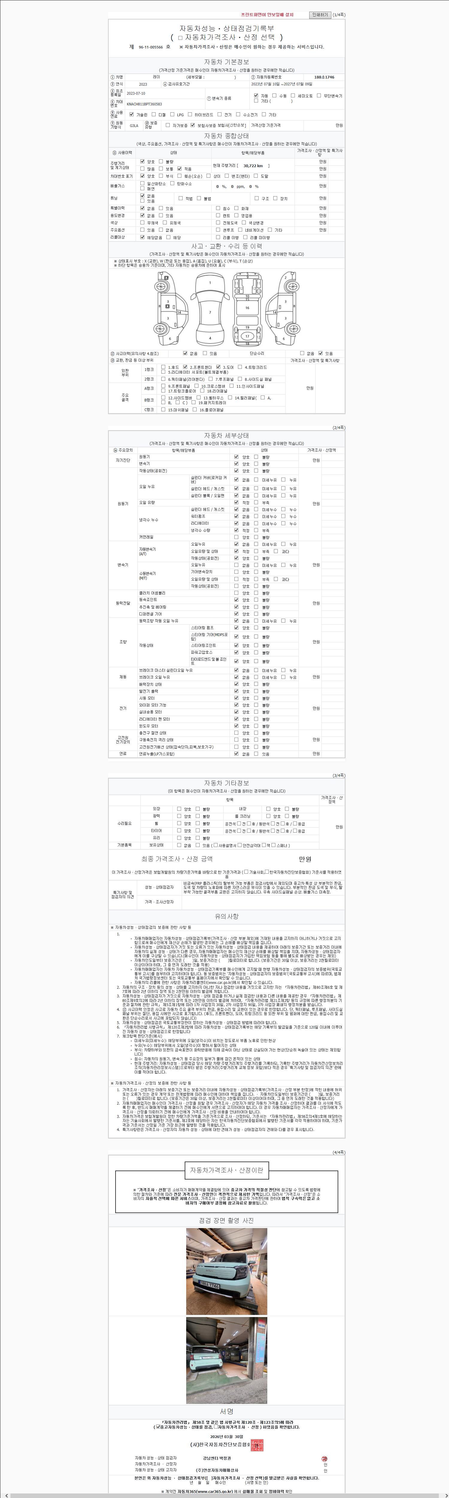 | 주행거리 | 30,722 km | 차량번호 | 188소1746 | 사고유무 | 성능기록부 참조 | 제시번호 | 제 2026039995 호 |