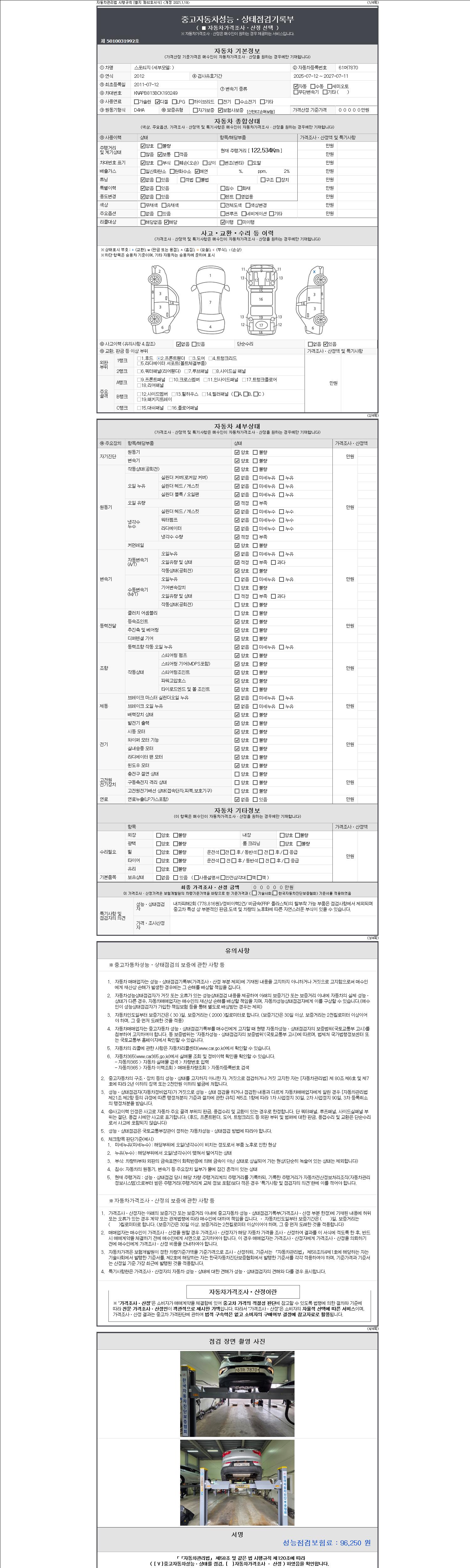 -중고자동차 매매업자를 통해 차량을 구입하실 경우 반드시 "중고자동차 성능, 상태점검 기록부"를 교뷰 받으셔야 하며, 매매업자는 반드시 의무 교부 하여야 압니다.