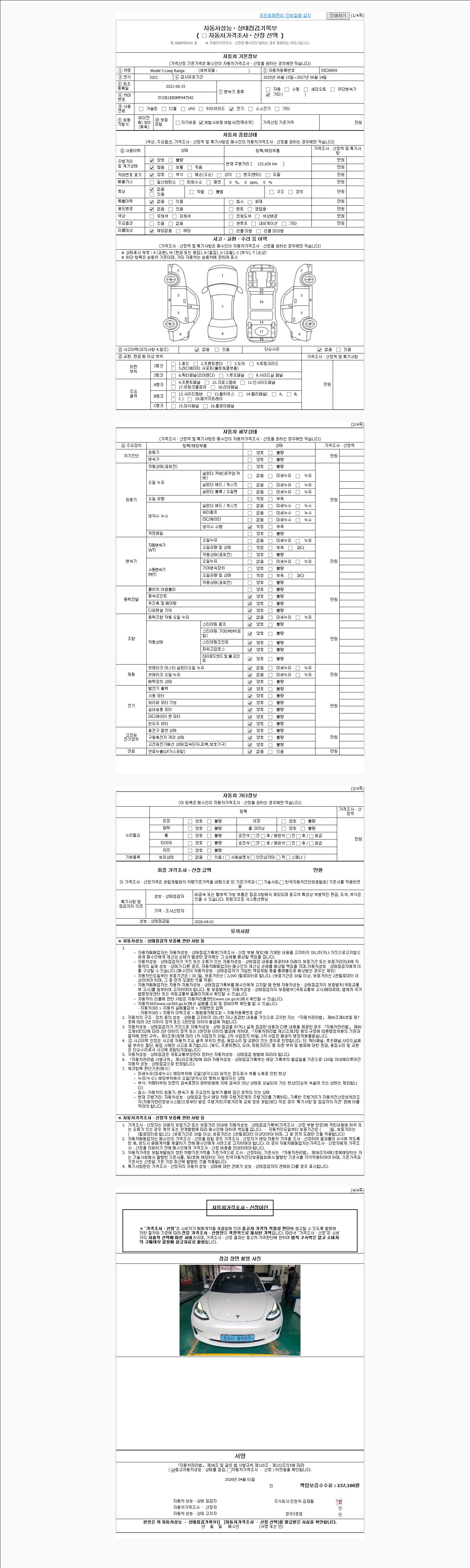 | 주행거리 | 131,626 km | 차량번호 | 55더8909 | 사고유무 | 성능기록부 참조 | 제시번호 | 제 2026016966 호 |