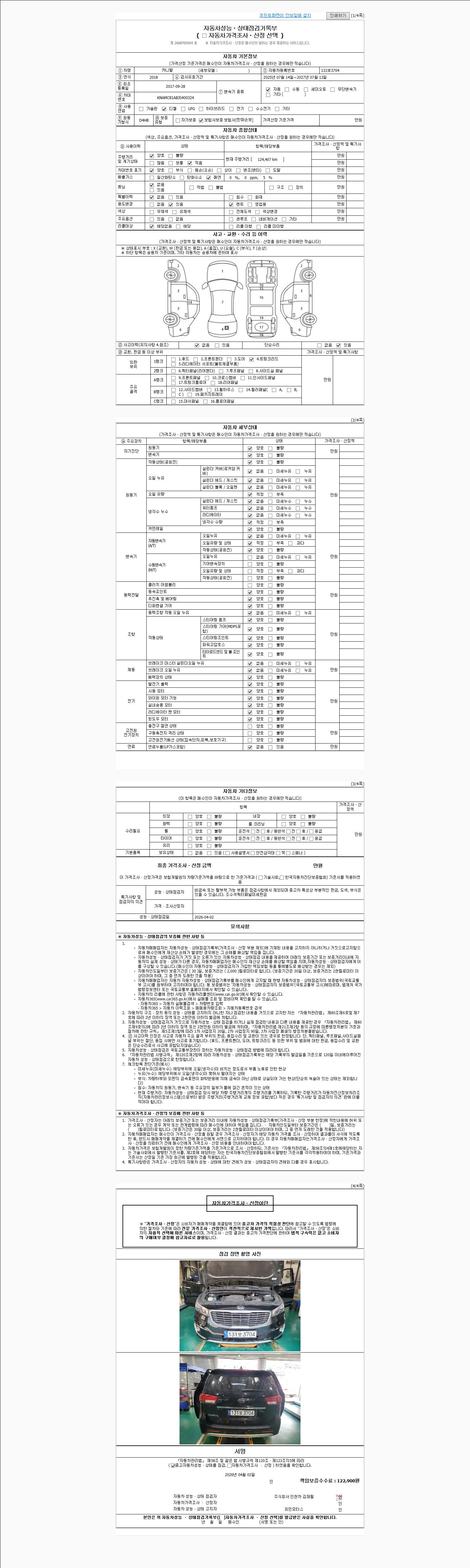 | 주행거리 | 124,407 km | 차량번호 | 131보3704 | 사고유무 | 성능기록부 참조 | 제시번호 | 제 2026017104 호 |