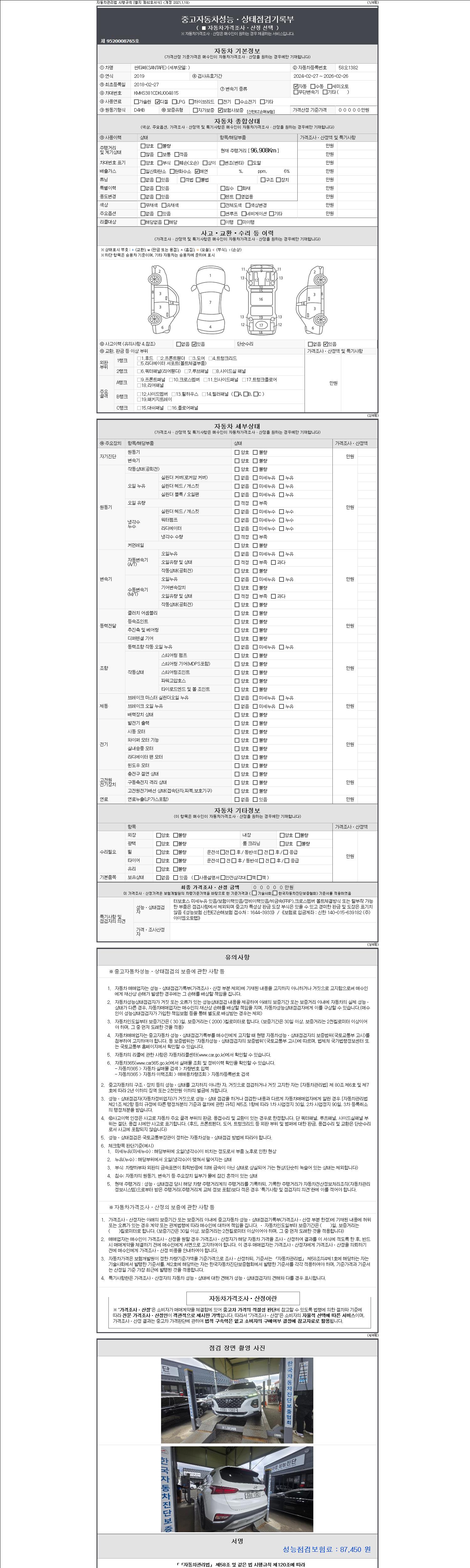 자동차관리법 시행규칙 제120조의 규정에 따라 별지 제 82호서식 《중고자동차 성능, 상태점검 기록부》를 발행한 성능, 상태점검자 및 매매자는 아래의 보증기간 또는 보증거리 이내의 중고자동차, 성능점검 기록부에 기재된 내용과 자동차의 실제 성능, 상태가 다른 경우 계약 또는 관계법령에 따라 매수인에 대하여 책임을 집니다.