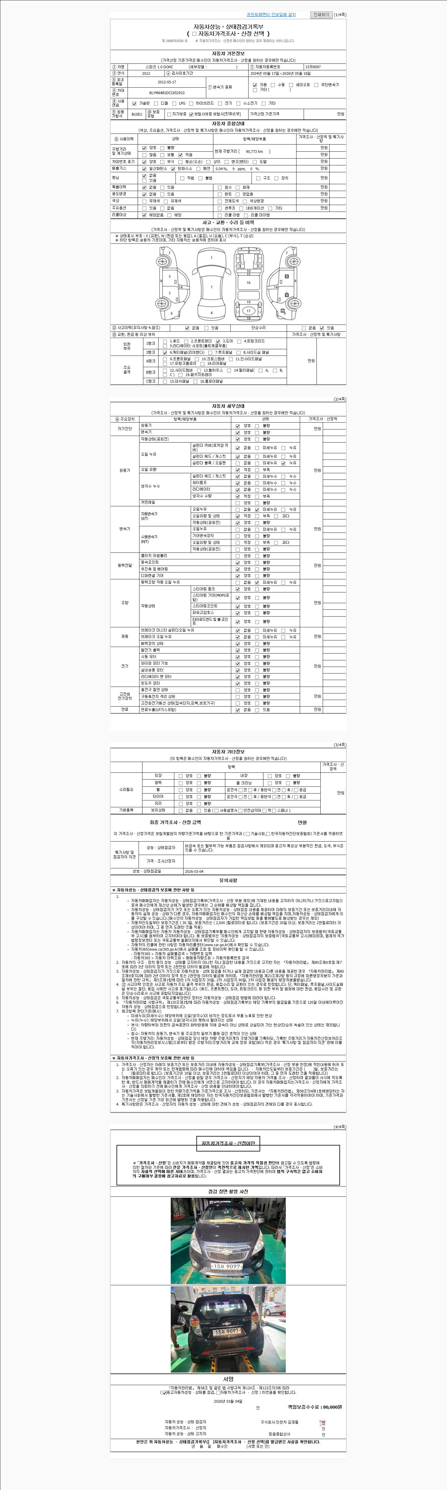 자동차관리법 시행규칙 제120조의 규정에 따라 별지 제 82호서식 《중고자동차 성능, 상태점검 기록부》를 발행한 성능, 상태점검자 및 매매자는 아래의 보증기간 또는 보증거리 이내의 중고자동차, 성능점검 기록부에 기재된 내용과 자동차의 실제 성능, 상태가 다른 경우 계약 또는 관계법령에 따라 매수인에 대하여 책임을 집니다.
