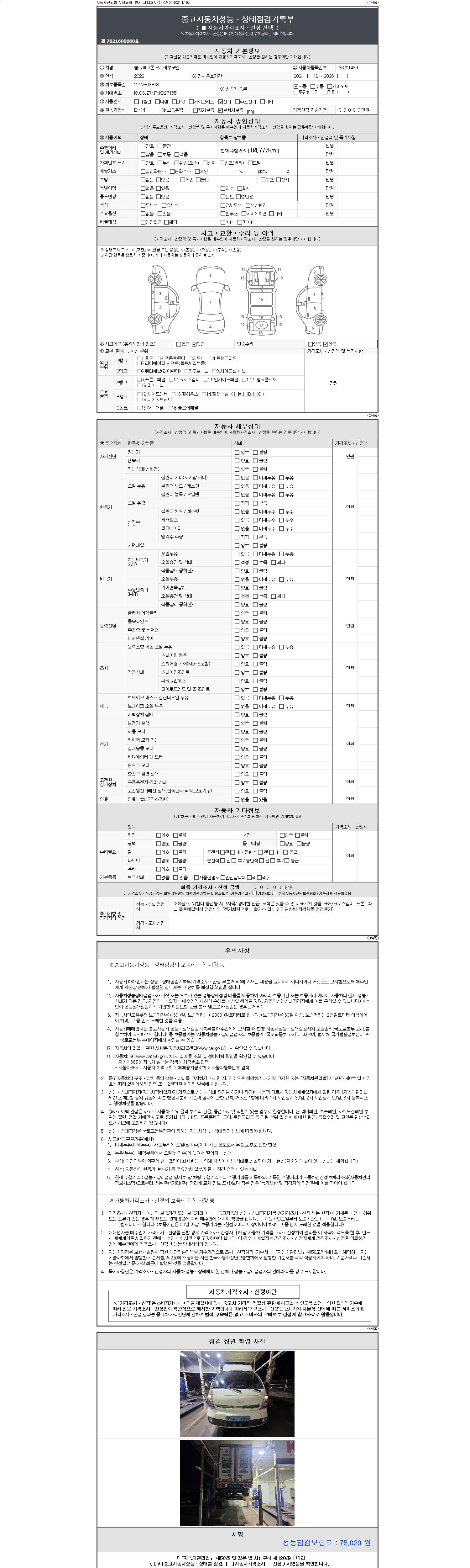 자동차관리법 시행규칙 제120조의 규정에 따라 별지 제 82호서식 《중고자동차 성능, 상태점검 기록부》를 발행한 성능, 상태점검자 및 매매자는 아래의 보증기간 또는 보증거리 이내의 중고자동차, 성능점검 기록부에 기재된 내용과 자동차의 실제 성능, 상태가 다른 경우 계약 또는 관계법령에 따라 매수인에 대하여 책임을 집니다.