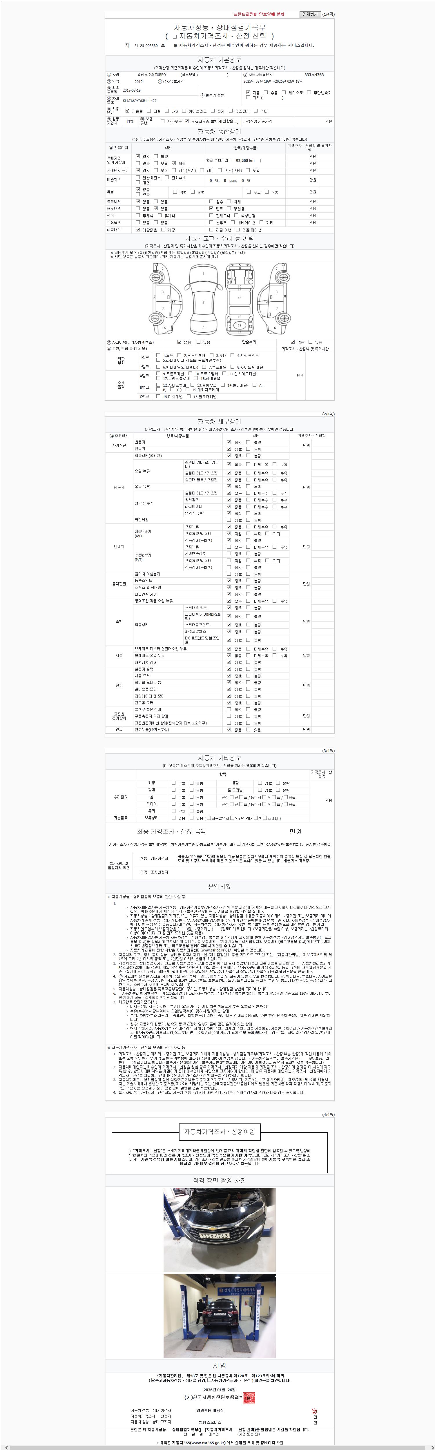 | 주행거리 | 92,197 km | 차량번호 | 333루4763 | 사고유무 | 성능기록부 참조 | 제시번호 | 제 2147483647 호 |