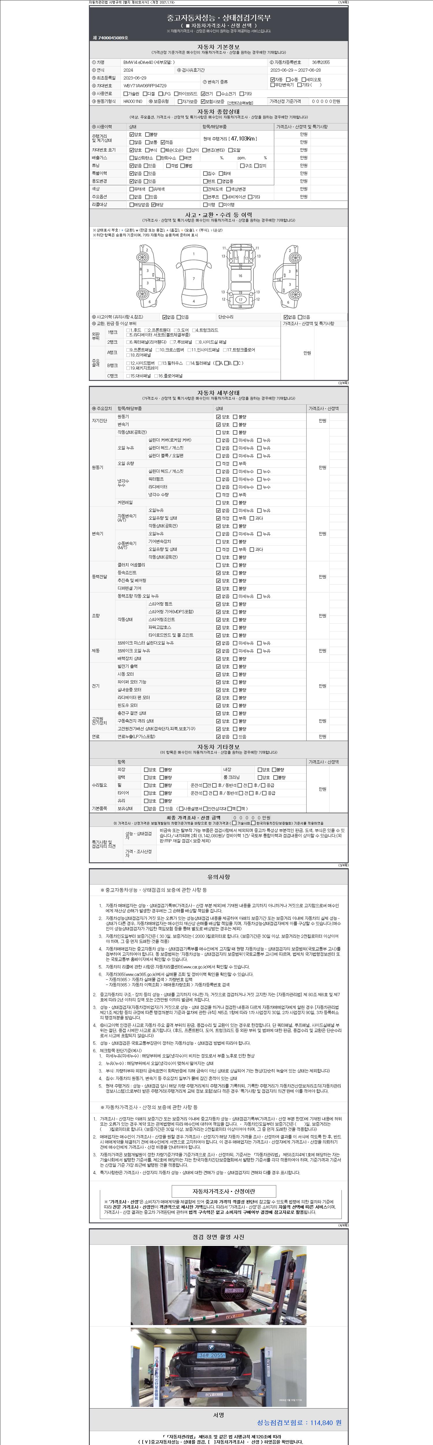 자동차관리법 시행규칙 제120조의 규정에 따라 별지 제 82호서식 《중고자동차 성능, 상태점검 기록부》를 발행한 성능, 상태점검자 및 매매자는 아래의 보증기간 또는 보증거리 이내의 중고자동차, 성능점검 기록부에 기재된 내용과 자동차의 실제 성능, 상태가 다른 경우 계약 또는 관계법령에 따라 매수인에 대하여 책임을 집니다.