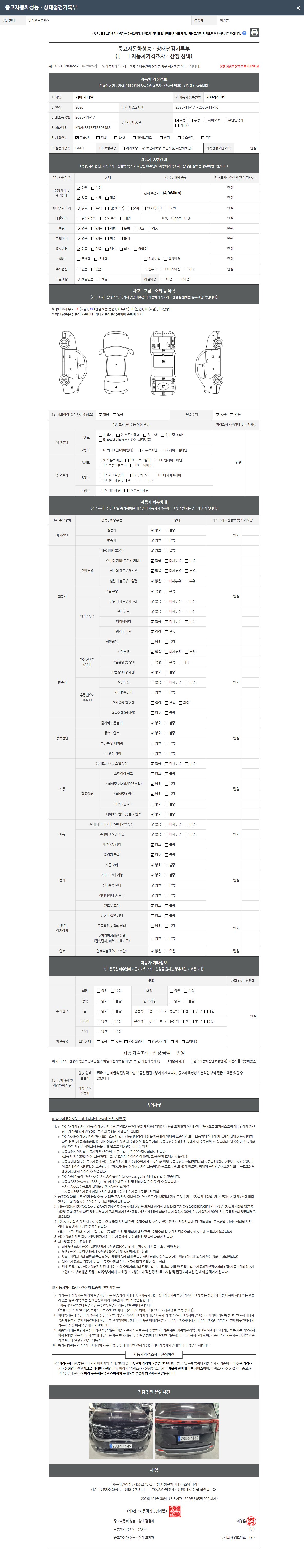 | 주행거리 | 4,963 km | 차량번호 | 280라4149 | 사고유무 | 성능기록부 참조 | 제시번호 | 제 2026013150 호 |