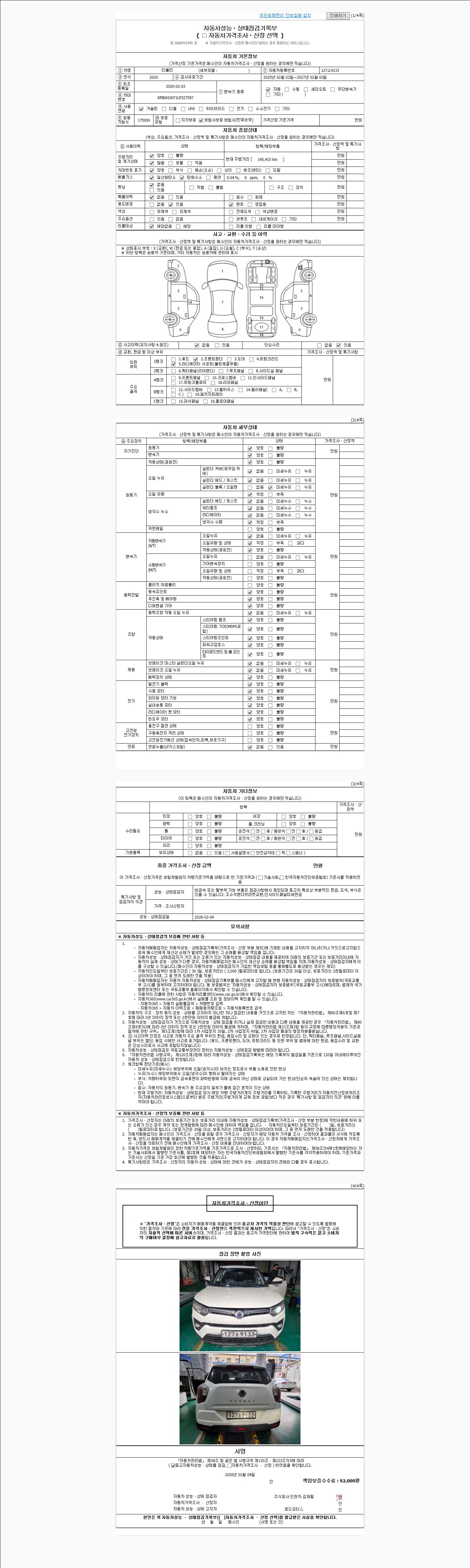 | 주행거리 | 145,170 km | 차량번호 | 127소9133 | 사고유무 | 성능기록부 참조 | 제시번호 | 제 2026006432 호 |