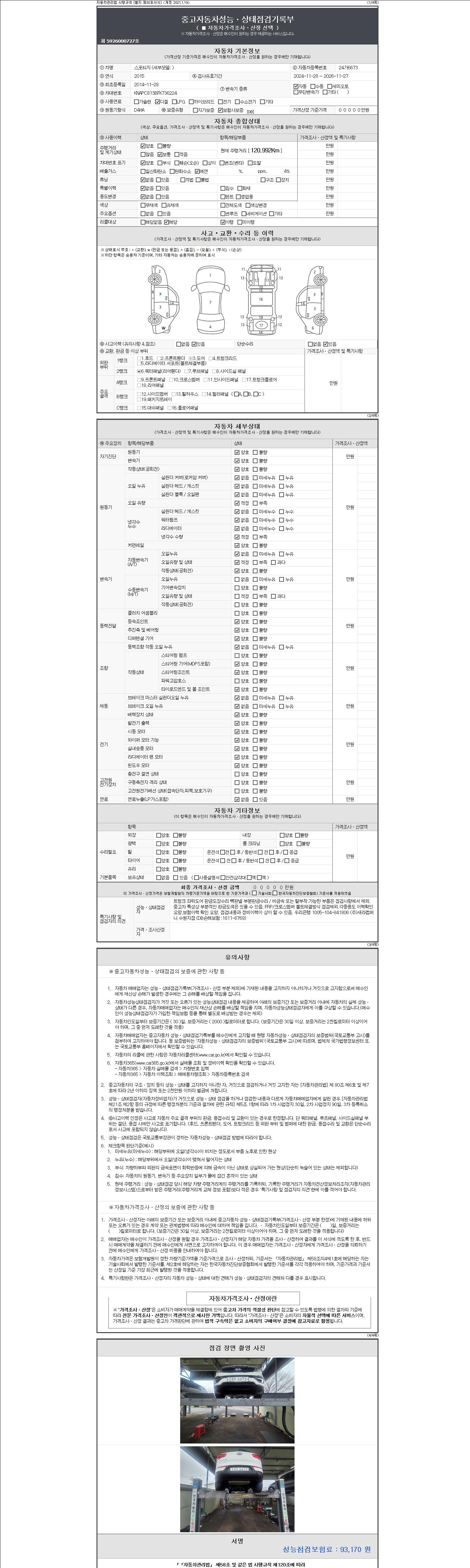 자동차관리법 시행규칙 제120조의 규정에 따라 별지 제 82호서식 《중고자동차 성능, 상태점검 기록부》를 발행한 성능, 상태점검자 및 매매자는 아래의 보증기간 또는 보증거리 이내의 중고자동차, 성능점검 기록부에 기재된 내용과 자동차의 실제 성능, 상태가 다른 경우 계약 또는 관계법령에 따라 매수인에 대하여 책임을 집니다.