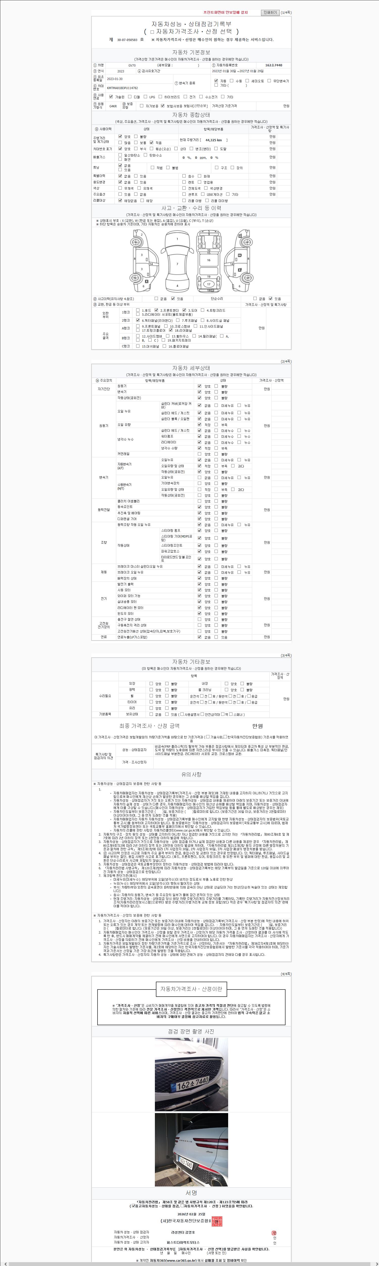 | 주행거리 | 44,325 km | 차량번호 | 162소7440 | 사고유무 | 성능기록부 참조 | 제시번호 | 제 2147483647 호 |