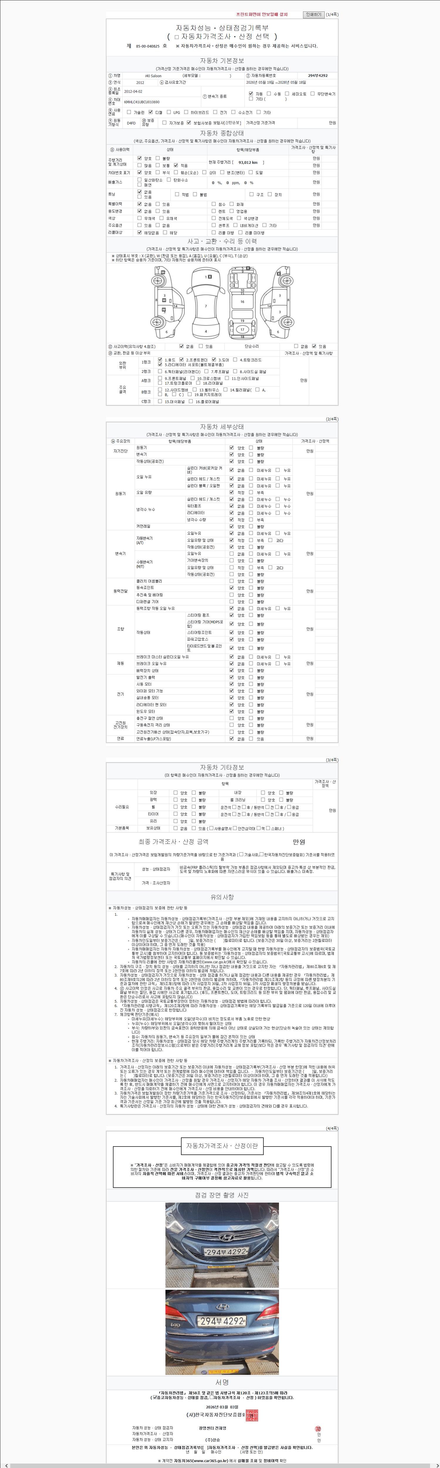 -중고자동차 매매업자를 통해 차량을 구입하실 경우 반드시 "중고자동차 성능, 상태점검 기록부"를 교뷰 받으셔야 하며, 매매업자는 반드시 의무 교부 하여야 압니다.