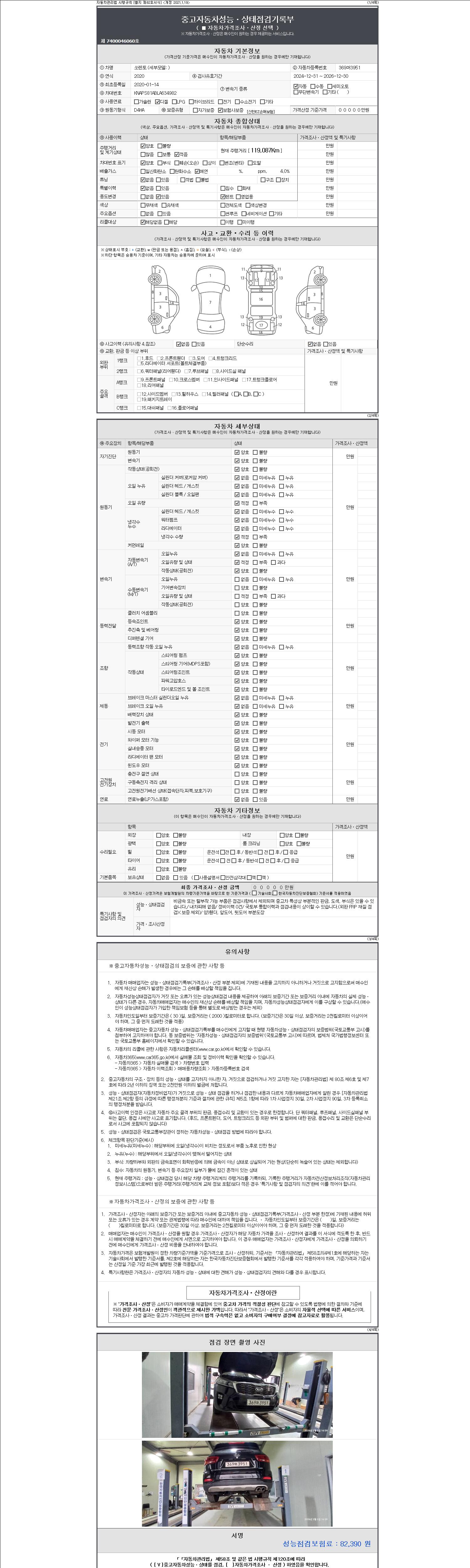 자동차관리법 시행규칙 제120조의 규정에 따라 별지 제 82호서식 《중고자동차 성능, 상태점검 기록부》를 발행한 성능, 상태점검자 및 매매자는 아래의 보증기간 또는 보증거리 이내의 중고자동차, 성능점검 기록부에 기재된 내용과 자동차의 실제 성능, 상태가 다른 경우 계약 또는 관계법령에 따라 매수인에 대하여 책임을 집니다.