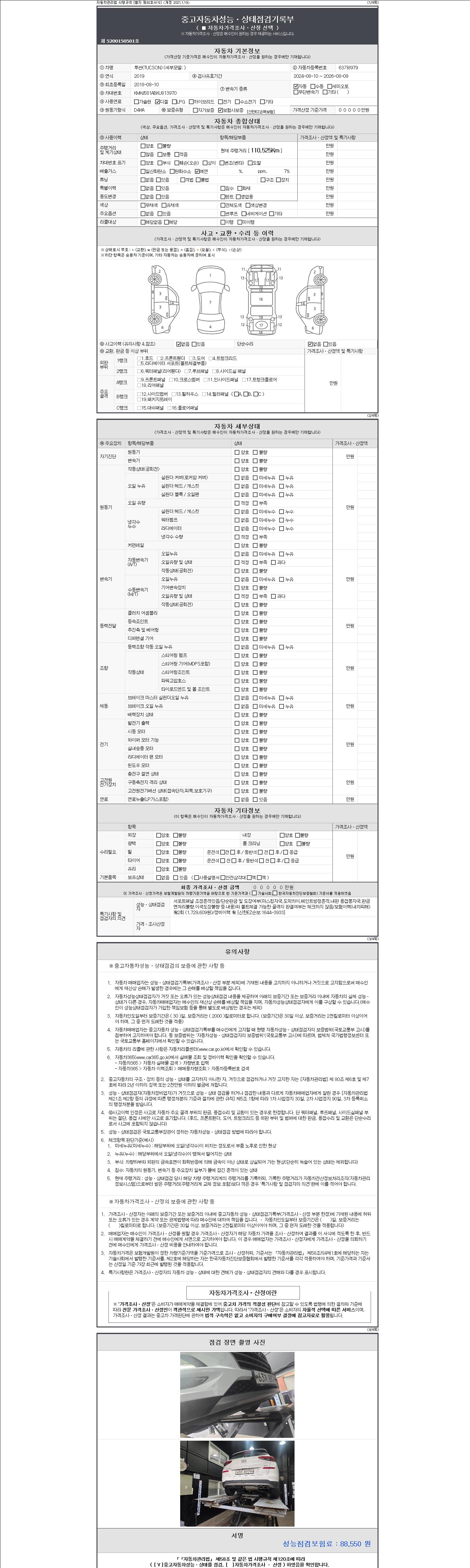 자동차관리법 시행규칙 제120조의 규정에 따라 별지 제 82호서식 《중고자동차 성능, 상태점검 기록부》를 발행한 성능, 상태점검자 및 매매자는 아래의 보증기간 또는 보증거리 이내의 중고자동차, 성능점검 기록부에 기재된 내용과 자동차의 실제 성능, 상태가 다른 경우 계약 또는 관계법령에 따라 매수인에 대하여 책임을 집니다.
