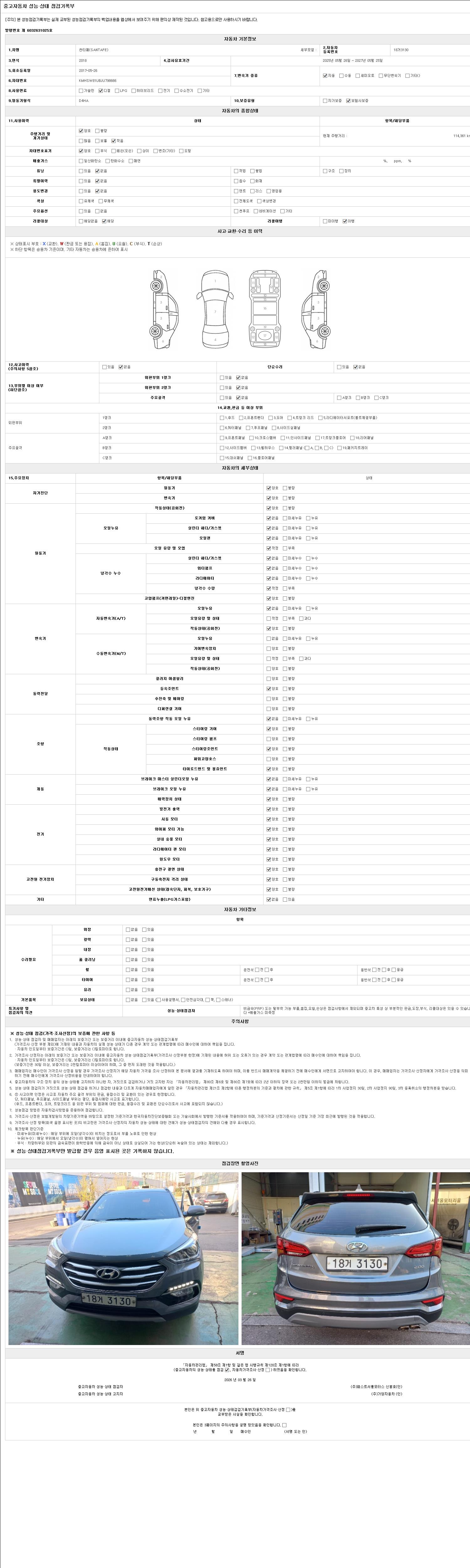 | 주행거리 | 114,000 km | 차량번호 | 18거3130 | 사고유무 | 성능기록부 참조 | 제시번호 | 제 2026009867 호 |
