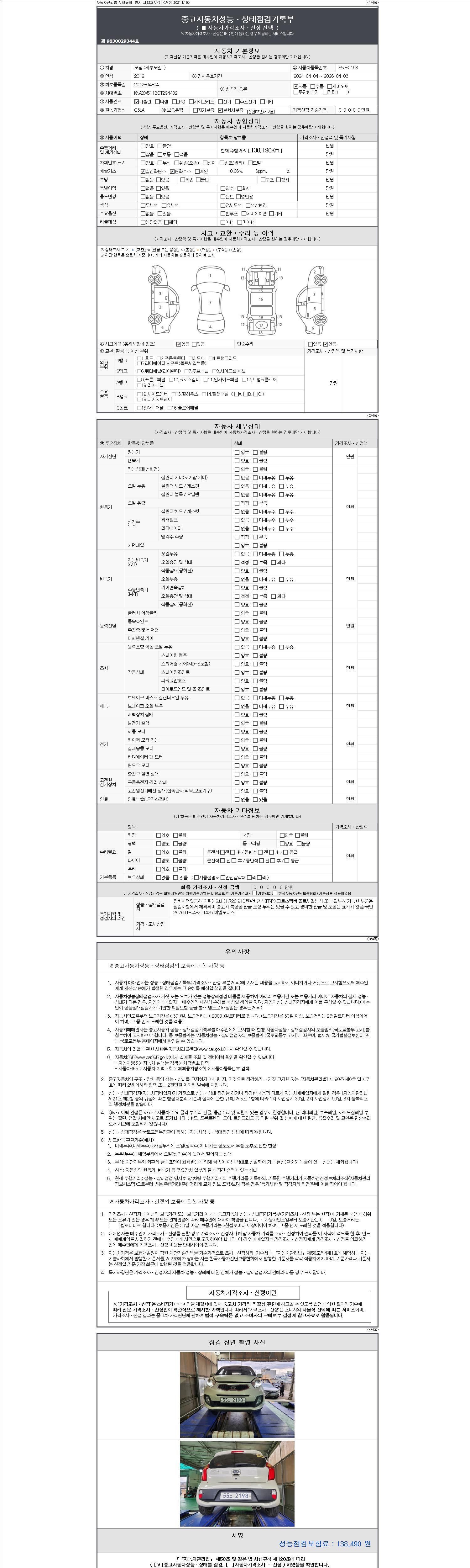 -중고자동차 매매업자를 통해 차량을 구입하실 경우 반드시 "중고자동차 성능, 상태점검 기록부"를 교뷰 받으셔야 하며, 매매업자는 반드시 의무 교부 하여야 압니다.