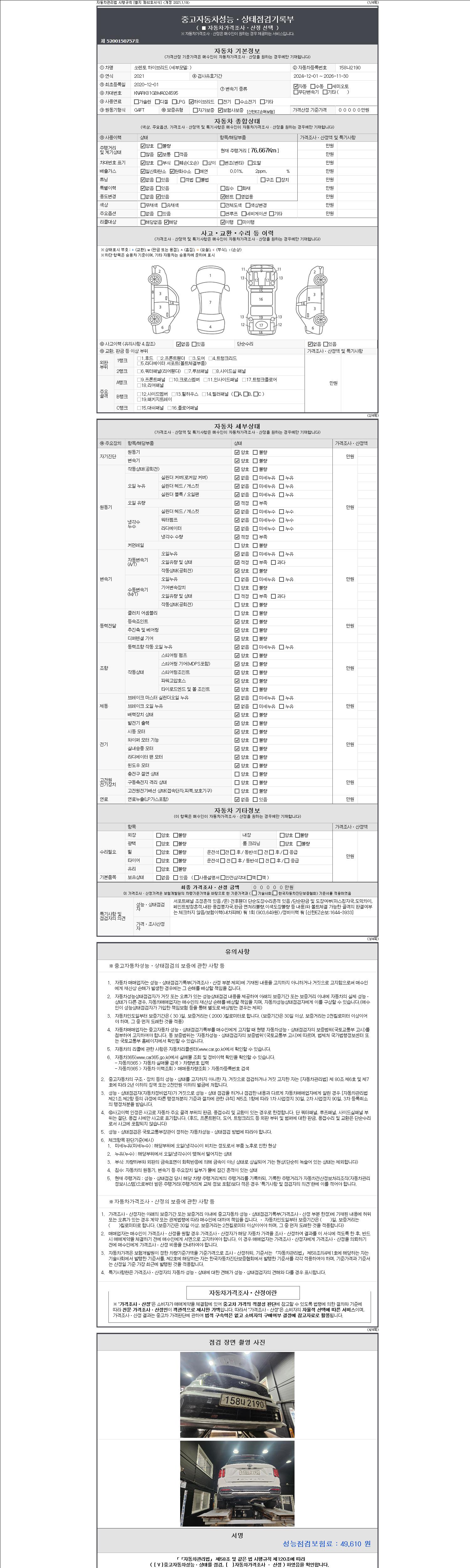 자동차관리법 시행규칙 제120조의 규정에 따라 별지 제 82호서식 《중고자동차 성능, 상태점검 기록부》를 발행한 성능, 상태점검자 및 매매자는 아래의 보증기간 또는 보증거리 이내의 중고자동차, 성능점검 기록부에 기재된 내용과 자동차의 실제 성능, 상태가 다른 경우 계약 또는 관계법령에 따라 매수인에 대하여 책임을 집니다.