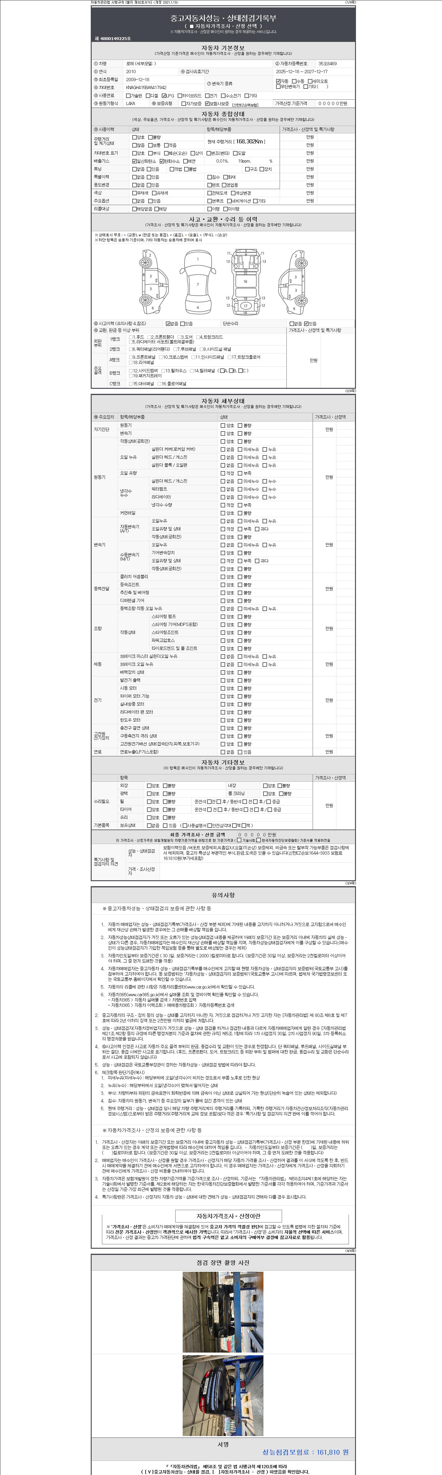 자동차관리법 시행규칙 제120조의 규정에 따라 별지 제 82호서식 《중고자동차 성능, 상태점검 기록부》를 발행한 성능, 상태점검자 및 매매자는 아래의 보증기간 또는 보증거리 이내의 중고자동차, 성능점검 기록부에 기재된 내용과 자동차의 실제 성능, 상태가 다른 경우 계약 또는 관계법령에 따라 매수인에 대하여 책임을 집니다.