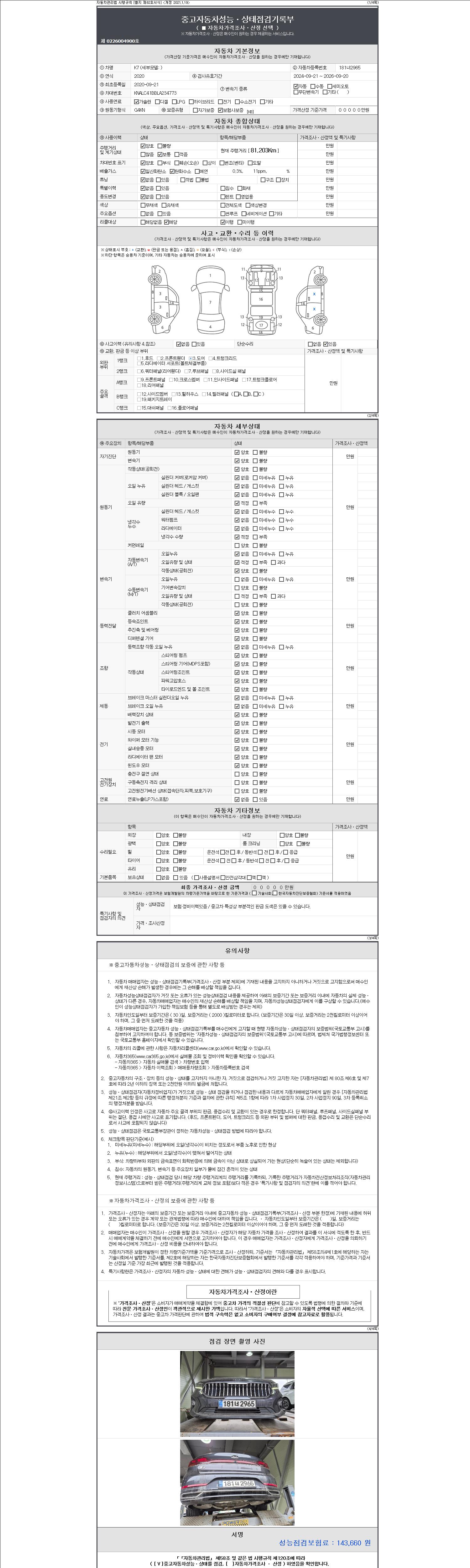 자동차관리법 시행규칙 제120조의 규정에 따라 별지 제 82호서식 《중고자동차 성능, 상태점검 기록부》를 발행한 성능, 상태점검자 및 매매자는 아래의 보증기간 또는 보증거리 이내의 중고자동차, 성능점검 기록부에 기재된 내용과 자동차의 실제 성능, 상태가 다른 경우 계약 또는 관계법령에 따라 매수인에 대하여 책임을 집니다.