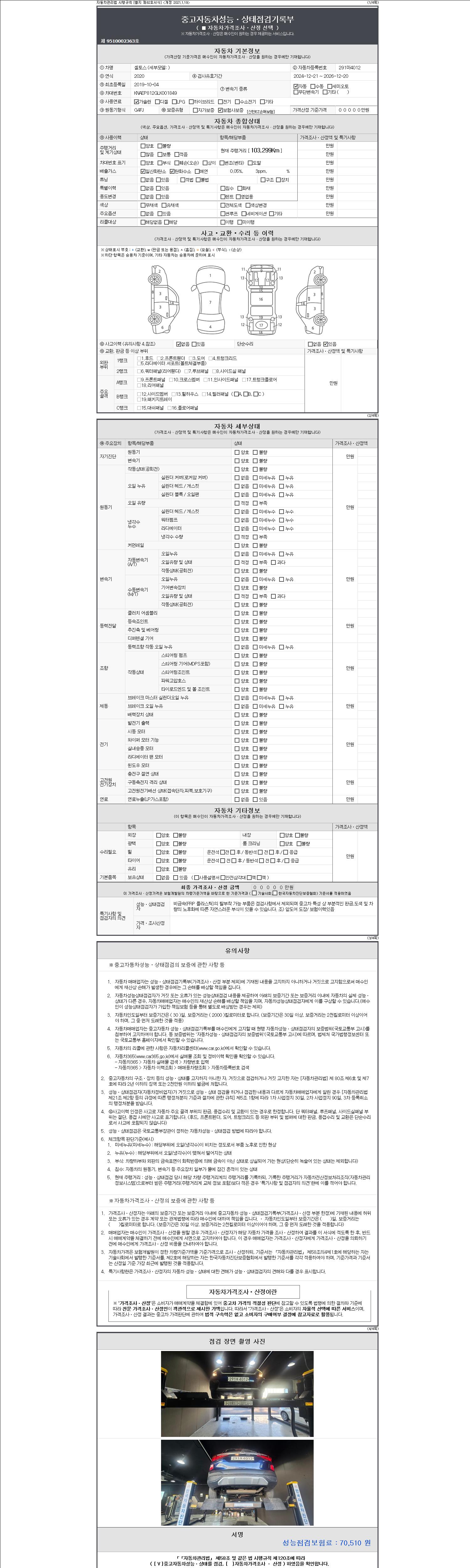 자동차관리법 시행규칙 제120조의 규정에 따라 별지 제 82호서식 《중고자동차 성능, 상태점검 기록부》를 발행한 성능, 상태점검자 및 매매자는 아래의 보증기간 또는 보증거리 이내의 중고자동차, 성능점검 기록부에 기재된 내용과 자동차의 실제 성능, 상태가 다른 경우 계약 또는 관계법령에 따라 매수인에 대하여 책임을 집니다.