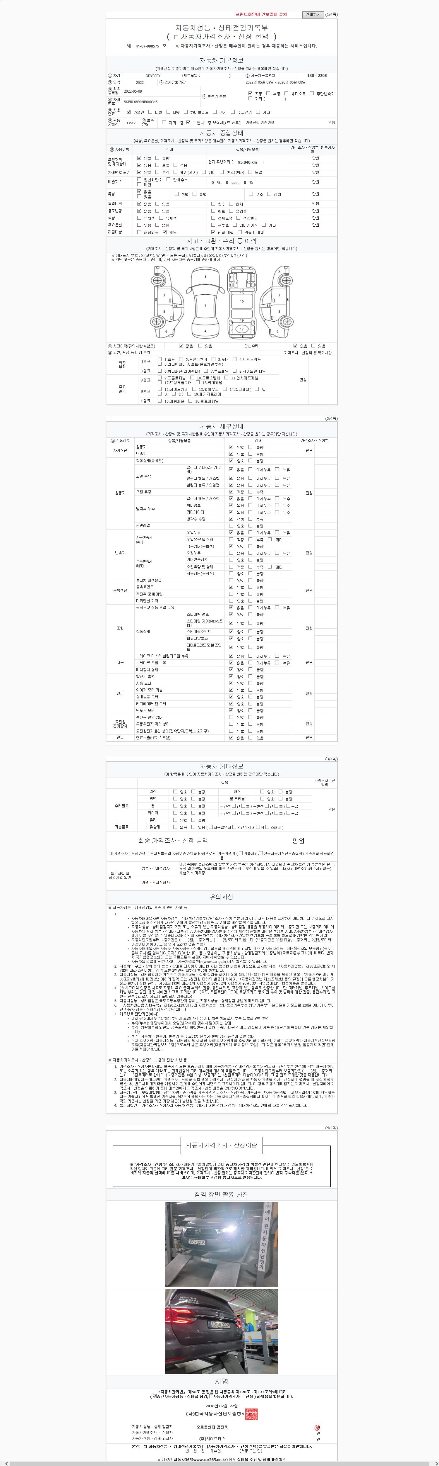 자동차관리법 시행규칙 제120조의 규정에 따라 별지 제 82호서식 《중고자동차 성능, 상태점검 기록부》를 발행한 성능, 상태점검자 및 매매자는 아래의 보증기간 또는 보증거리 이내의 중고자동차, 성능점검 기록부에 기재된 내용과 자동차의 실제 성능, 상태가 다른 경우 계약 또는 관계법령에 따라 매수인에 대하여 책임을 집니다.