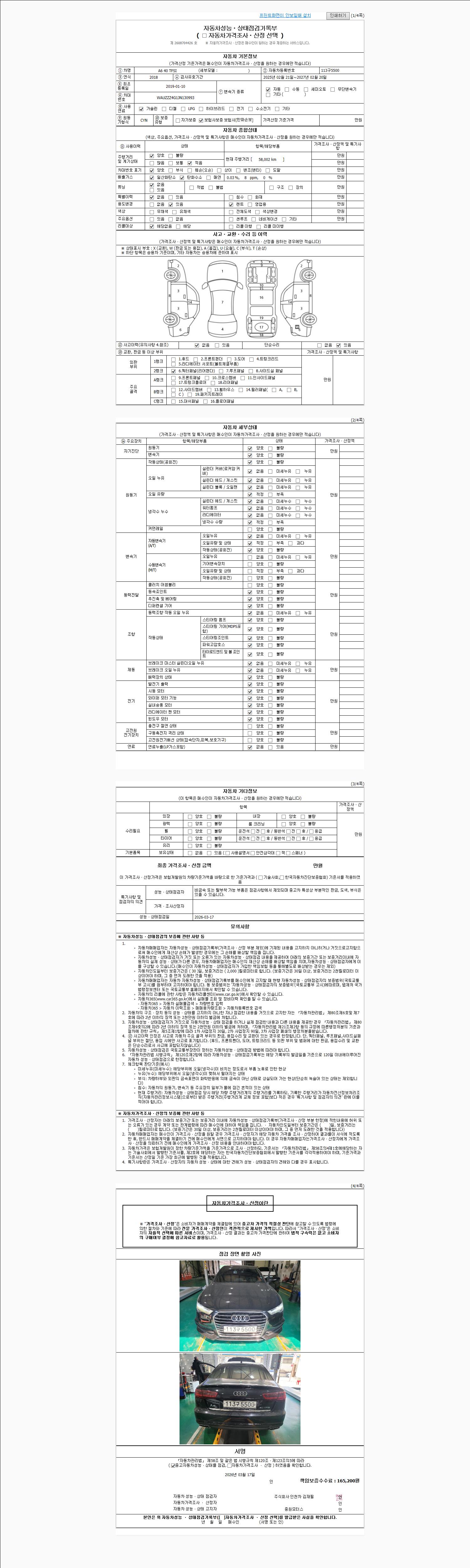 | 주행거리 | 58,002 km | 차량번호 | 113구5500 | 사고유무 | 성능기록부 참조 | 제시번호 | 제 2026014005 호 |