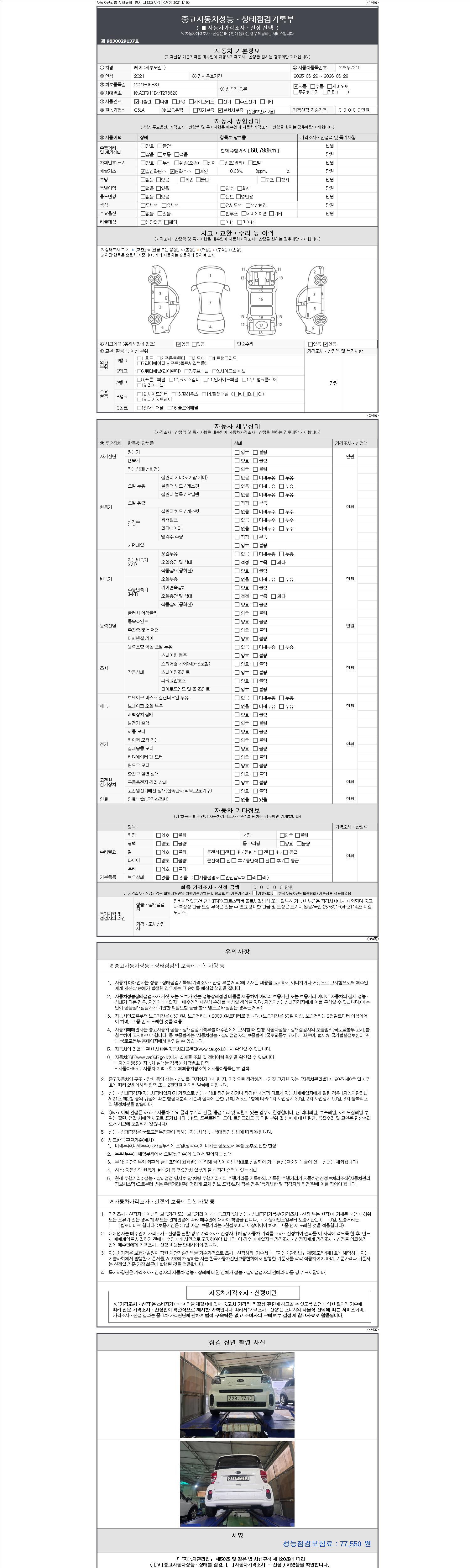 -중고자동차 매매업자를 통해 차량을 구입하실 경우 반드시 "중고자동차 성능, 상태점검 기록부"를 교뷰 받으셔야 하며, 매매업자는 반드시 의무 교부 하여야 압니다.