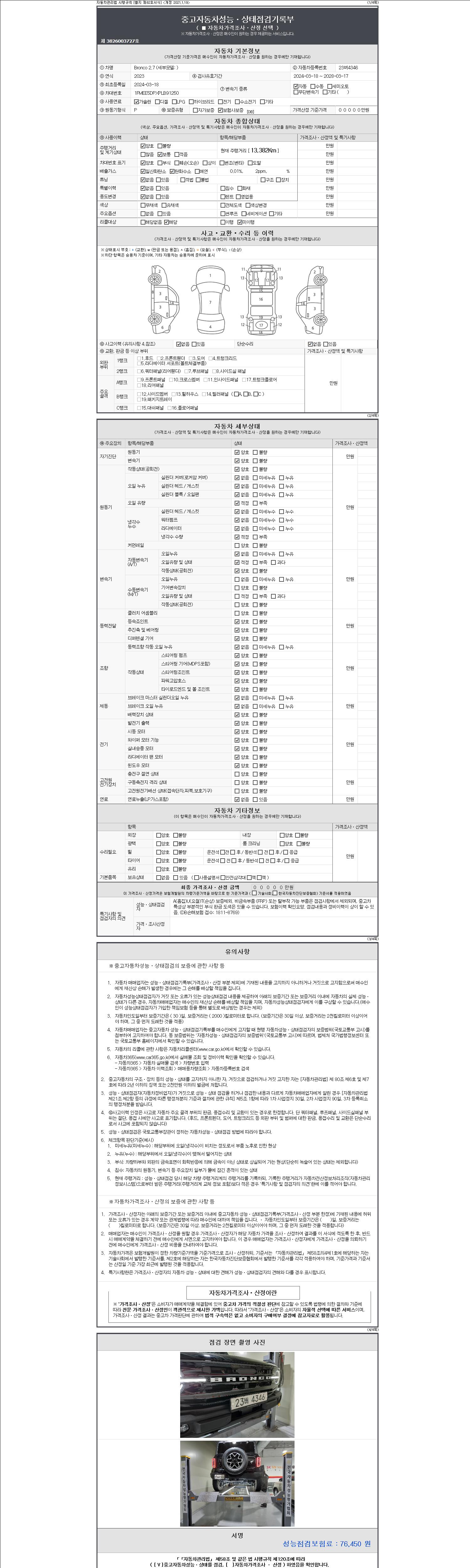 자동차관리법 시행규칙 제120조의 규정에 따라 별지 제 82호서식 《중고자동차 성능, 상태점검 기록부》를 발행한 성능, 상태점검자 및 매매자는 아래의 보증기간 또는 보증거리 이내의 중고자동차, 성능점검 기록부에 기재된 내용과 자동차의 실제 성능, 상태가 다른 경우 계약 또는 관계법령에 따라 매수인에 대하여 책임을 집니다.