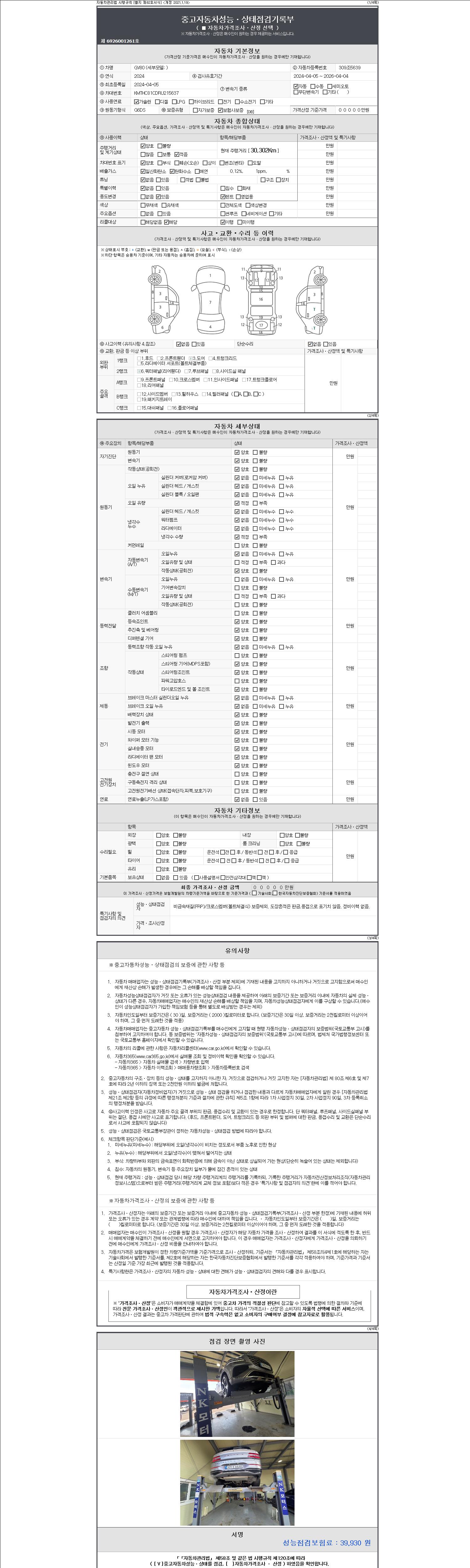 자동차관리법 시행규칙 제120조의 규정에 따라 별지 제 82호서식 《중고자동차 성능, 상태점검 기록부》를 발행한 성능, 상태점검자 및 매매자는 아래의 보증기간 또는 보증거리 이내의 중고자동차, 성능점검 기록부에 기재된 내용과 자동차의 실제 성능, 상태가 다른 경우 계약 또는 관계법령에 따라 매수인에 대하여 책임을 집니다.