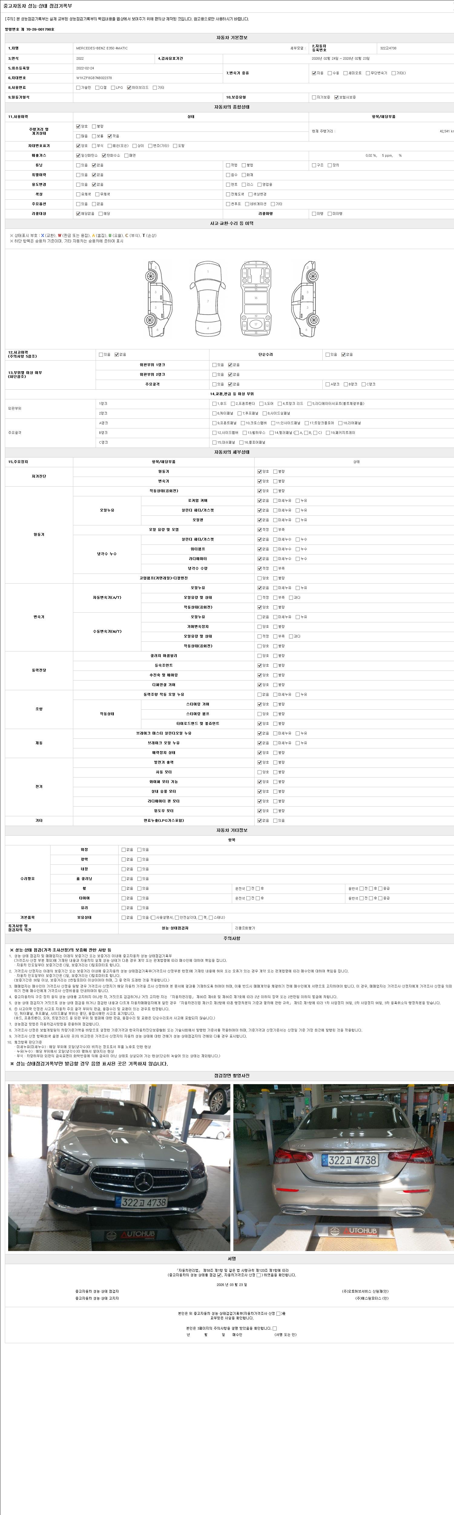 자동차관리법 시행규칙 제120조의 규정에 따라 별지 제 82호서식 《중고자동차 성능, 상태점검 기록부》를 발행한 성능, 상태점검자 및 매매자는 아래의 보증기간 또는 보증거리 이내의 중고자동차, 성능점검 기록부에 기재된 내용과 자동차의 실제 성능, 상태가 다른 경우 계약 또는 관계법령에 따라 매수인에 대하여 책임을 집니다.