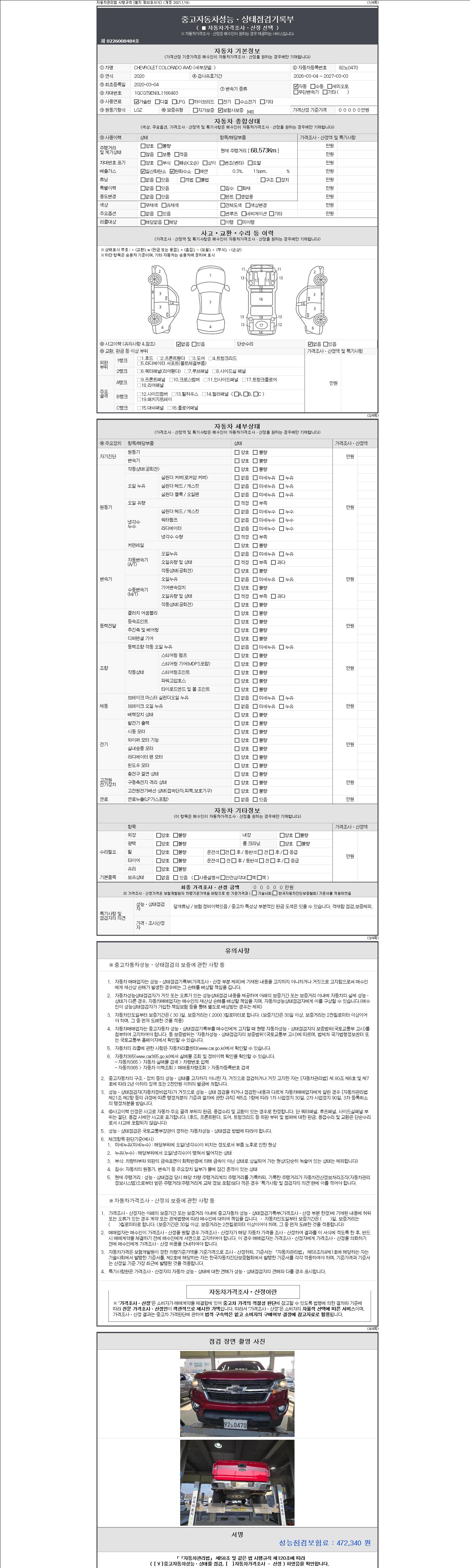 | 주행거리 | 68,573 km | 차량번호 | 92노0470 | 사고유무 | 성능기록부 참조 | 제시번호 | 제 2147483647 호 |
