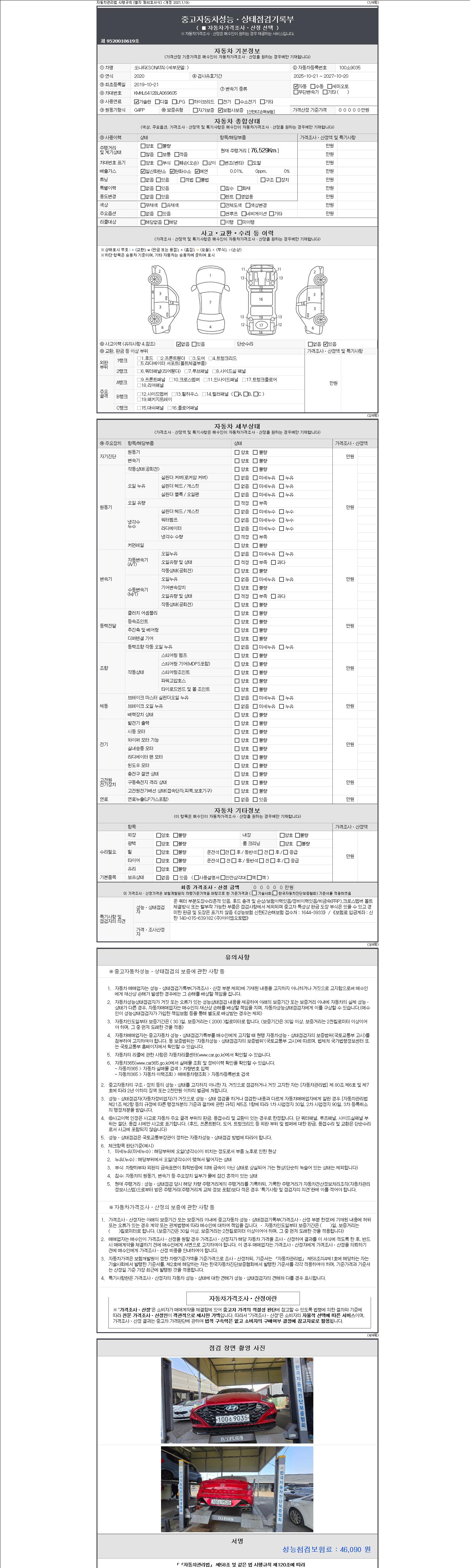 자동차관리법 시행규칙 제120조의 규정에 따라 별지 제 82호서식 《중고자동차 성능, 상태점검 기록부》를 발행한 성능, 상태점검자 및 매매자는 아래의 보증기간 또는 보증거리 이내의 중고자동차, 성능점검 기록부에 기재된 내용과 자동차의 실제 성능, 상태가 다른 경우 계약 또는 관계법령에 따라 매수인에 대하여 책임을 집니다.