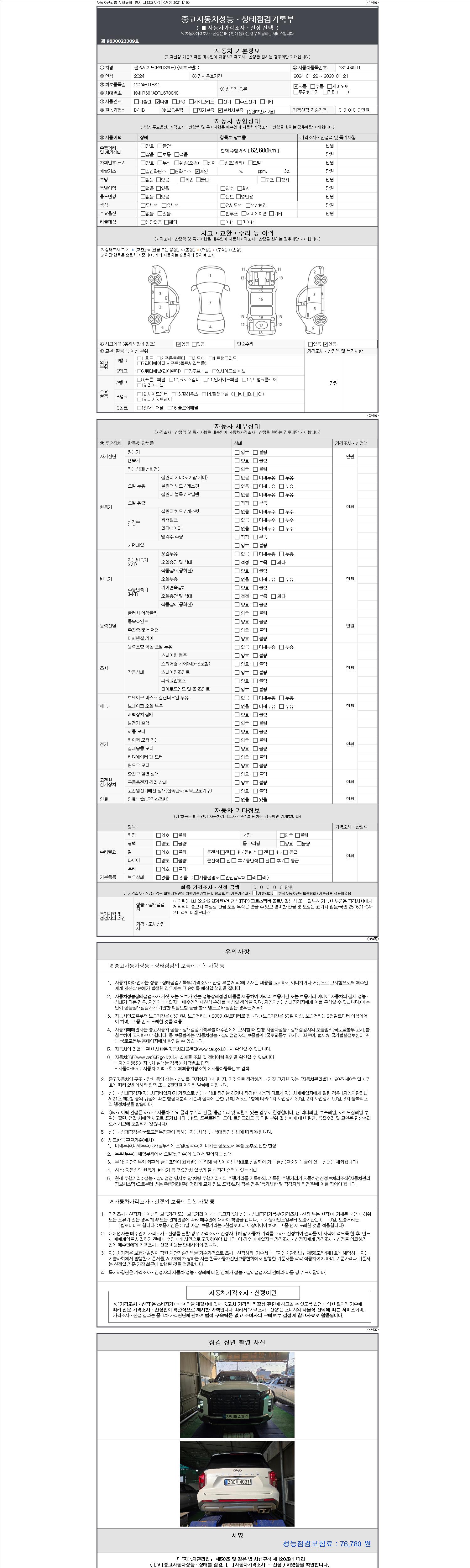 자동차관리법 시행규칙 제120조의 규정에 따라 별지 제 82호서식 《중고자동차 성능, 상태점검 기록부》를 발행한 성능, 상태점검자 및 매매자는 아래의 보증기간 또는 보증거리 이내의 중고자동차, 성능점검 기록부에 기재된 내용과 자동차의 실제 성능, 상태가 다른 경우 계약 또는 관계법령에 따라 매수인에 대하여 책임을 집니다.