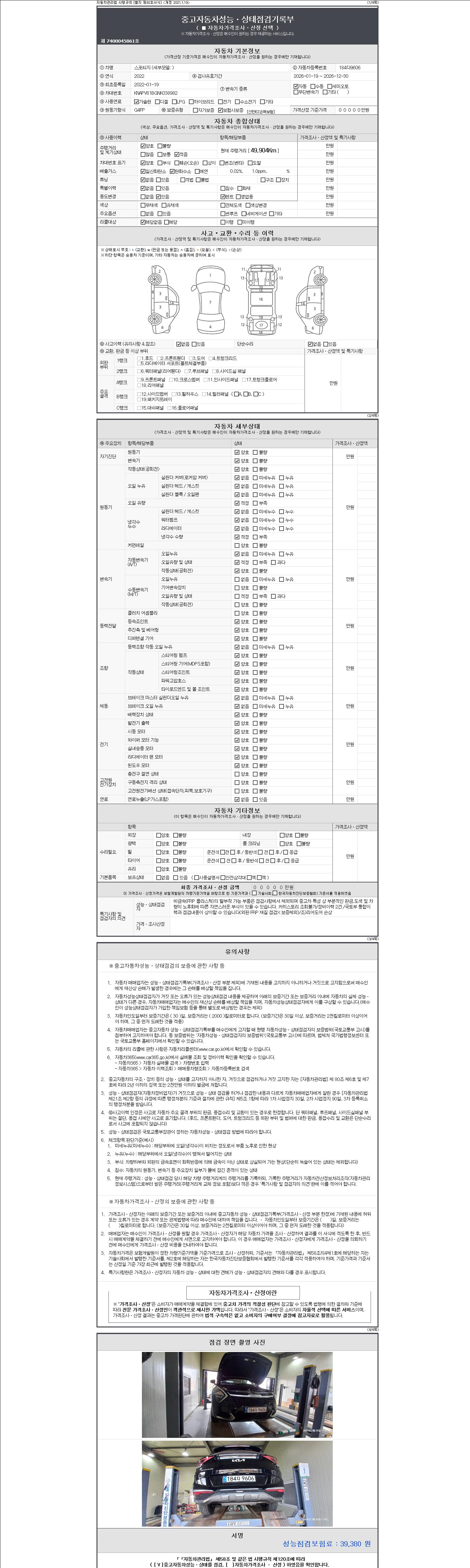자동차관리법 시행규칙 제120조의 규정에 따라 별지 제 82호서식 《중고자동차 성능, 상태점검 기록부》를 발행한 성능, 상태점검자 및 매매자는 아래의 보증기간 또는 보증거리 이내의 중고자동차, 성능점검 기록부에 기재된 내용과 자동차의 실제 성능, 상태가 다른 경우 계약 또는 관계법령에 따라 매수인에 대하여 책임을 집니다.