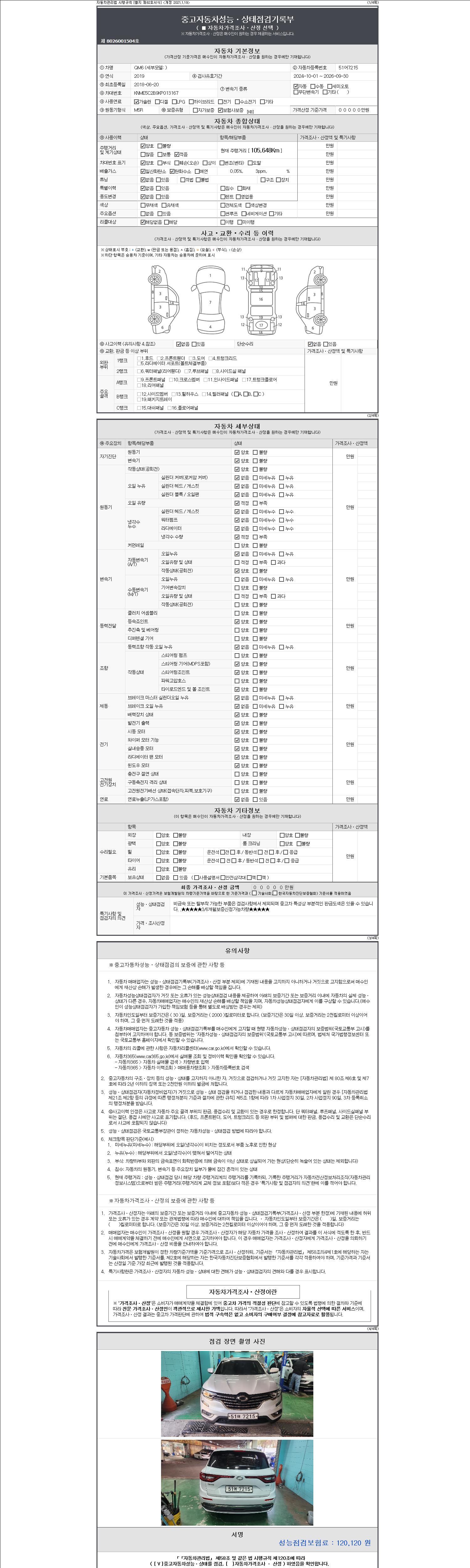 자동차관리법 시행규칙 제120조의 규정에 따라 별지 제 82호서식 《중고자동차 성능, 상태점검 기록부》를 발행한 성능, 상태점검자 및 매매자는 아래의 보증기간 또는 보증거리 이내의 중고자동차, 성능점검 기록부에 기재된 내용과 자동차의 실제 성능, 상태가 다른 경우 계약 또는 관계법령에 따라 매수인에 대하여 책임을 집니다.