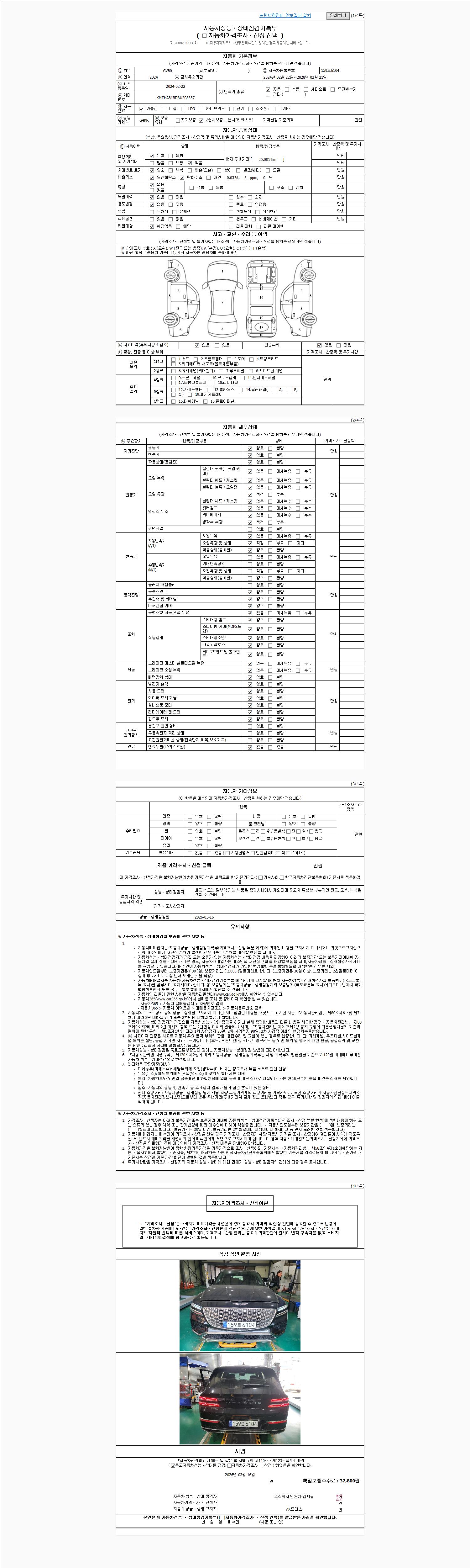 | 주행거리 | 25,001 km | 차량번호 | 159로6104 | 사고유무 | 성능기록부 참조 | 제시번호 | 제 2026012952 호 |