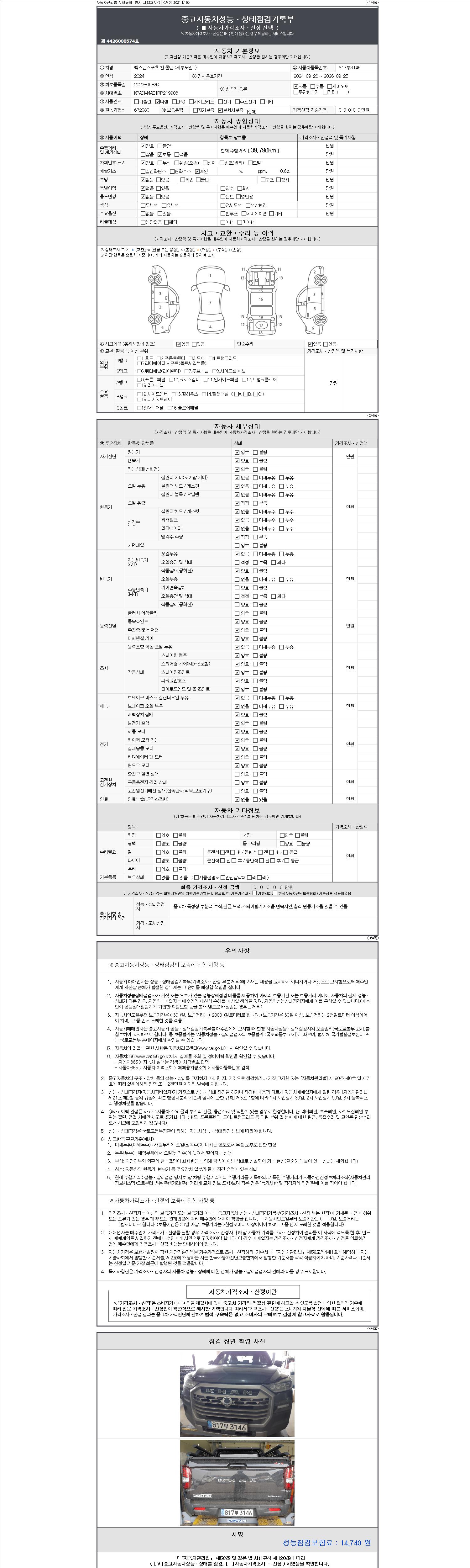 | 주행거리 | 39,790 km | 차량번호 | 817부3146 | 사고유무 | 성능기록부 참조 | 제시번호 | 제 2147483647 호 |