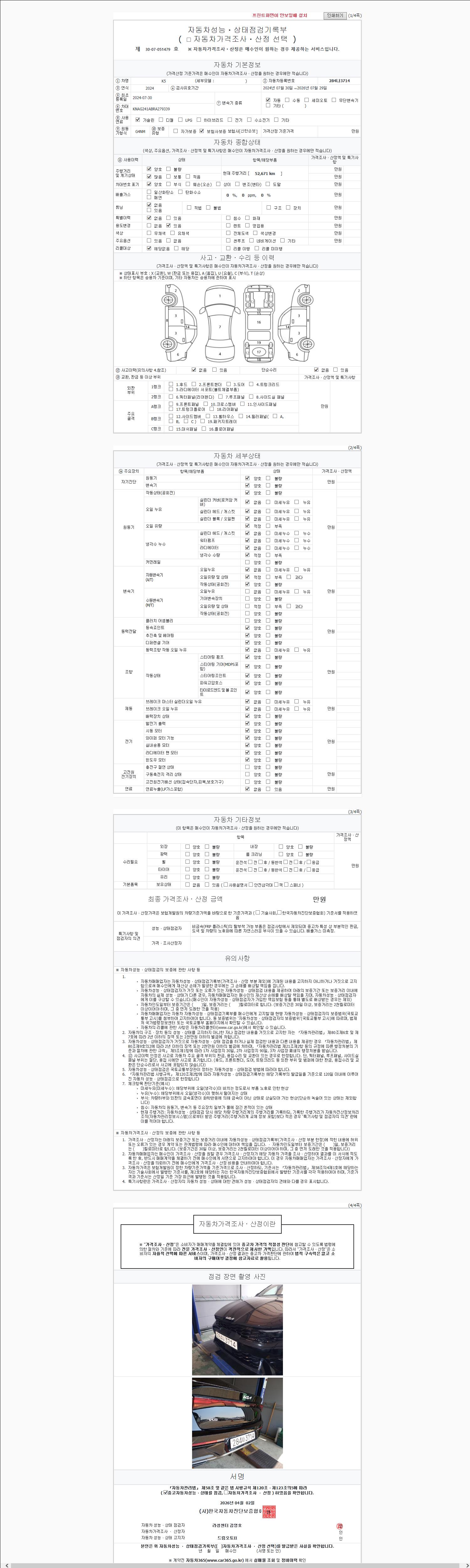 | 주행거리 | 52,594 km | 차량번호 | 284나3714 | 사고유무 | 성능기록부 참조 | 제시번호 | 제 2147483647 호 |