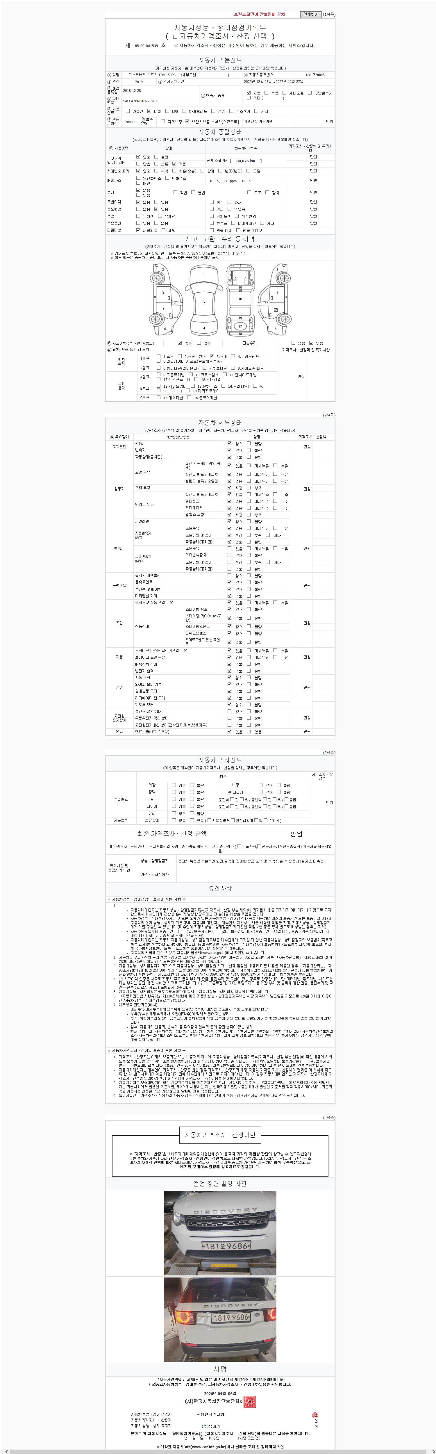 자동차관리법 시행규칙 제120조의 규정에 따라 별지 제 82호서식 《중고자동차 성능, 상태점검 기록부》를 발행한 성능, 상태점검자 및 매매자는 아래의 보증기간 또는 보증거리 이내의 중고자동차, 성능점검 기록부에 기재된 내용과 자동차의 실제 성능, 상태가 다른 경우 계약 또는 관계법령에 따라 매수인에 대하여 책임을 집니다.