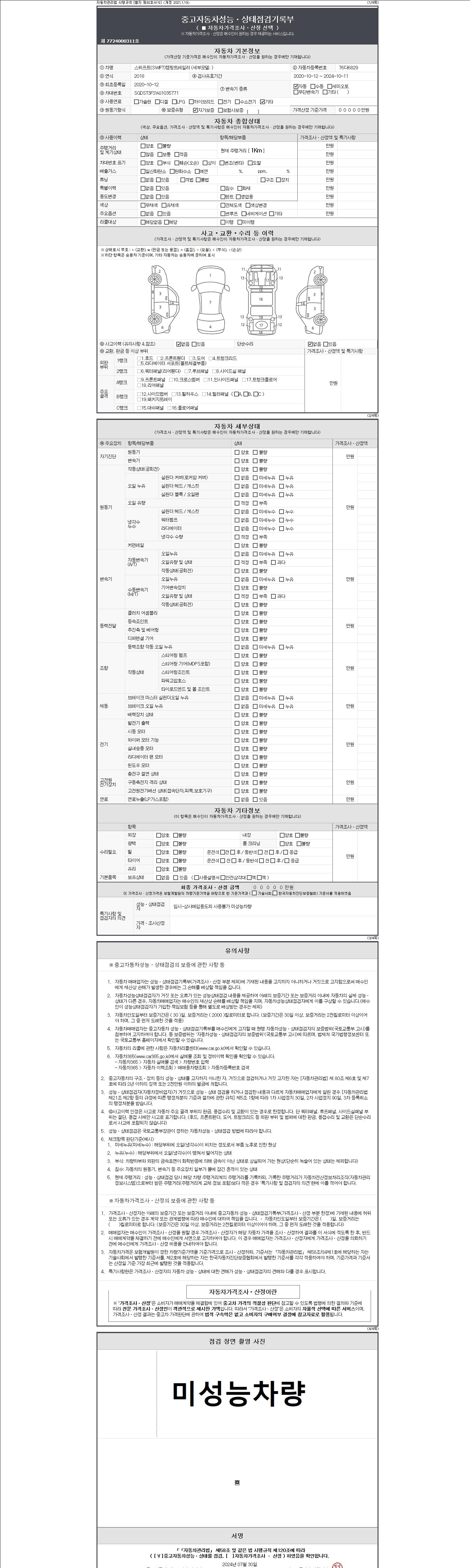 자동차관리법 시행규칙 제120조의 규정에 따라 별지 제 82호서식 《중고자동차 성능, 상태점검 기록부》를 발행한 성능, 상태점검자 및 매매자는 아래의 보증기간 또는 보증거리 이내의 중고자동차, 성능점검 기록부에 기재된 내용과 자동차의 실제 성능, 상태가 다른 경우 계약 또는 관계법령에 따라 매수인에 대하여 책임을 집니다.