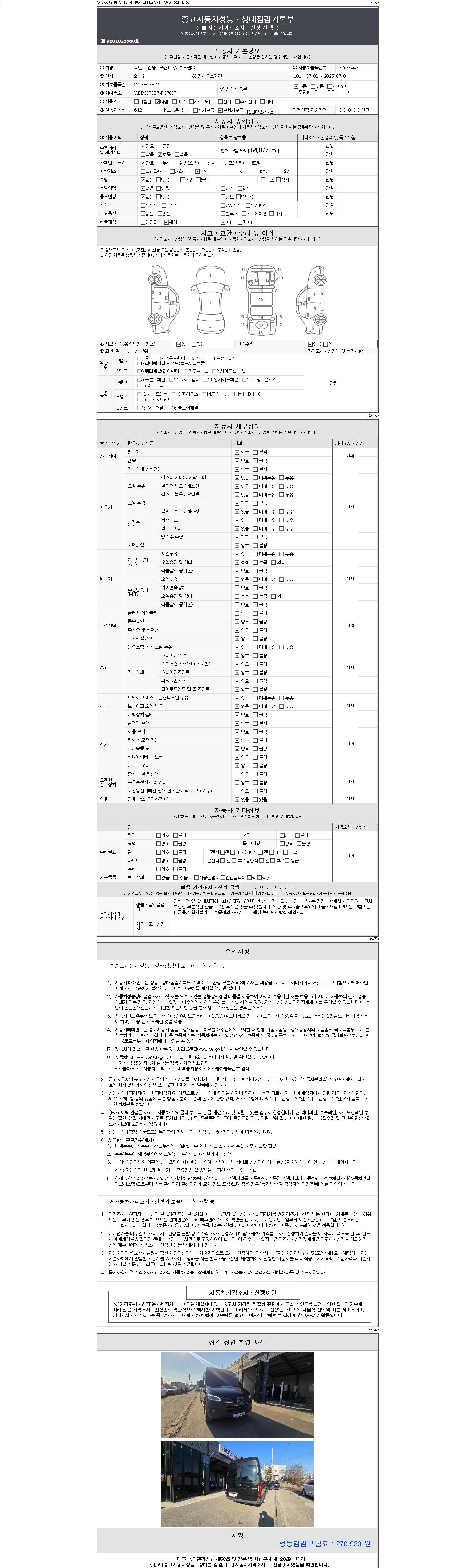 자동차관리법 시행규칙 제120조의 규정에 따라 별지 제 82호서식 《중고자동차 성능, 상태점검 기록부》를 발행한 성능, 상태점검자 및 매매자는 아래의 보증기간 또는 보증거리 이내의 중고자동차, 성능점검 기록부에 기재된 내용과 자동차의 실제 성능, 상태가 다른 경우 계약 또는 관계법령에 따라 매수인에 대하여 책임을 집니다.