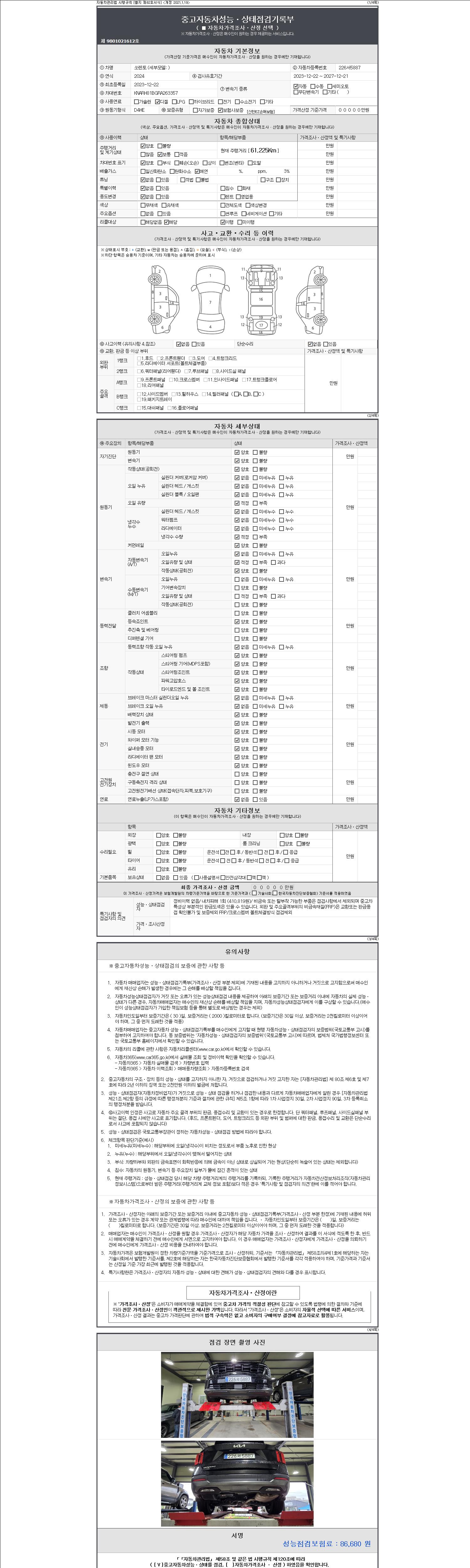 자동차관리법 시행규칙 제120조의 규정에 따라 별지 제 82호서식 《중고자동차 성능, 상태점검 기록부》를 발행한 성능, 상태점검자 및 매매자는 아래의 보증기간 또는 보증거리 이내의 중고자동차, 성능점검 기록부에 기재된 내용과 자동차의 실제 성능, 상태가 다른 경우 계약 또는 관계법령에 따라 매수인에 대하여 책임을 집니다.