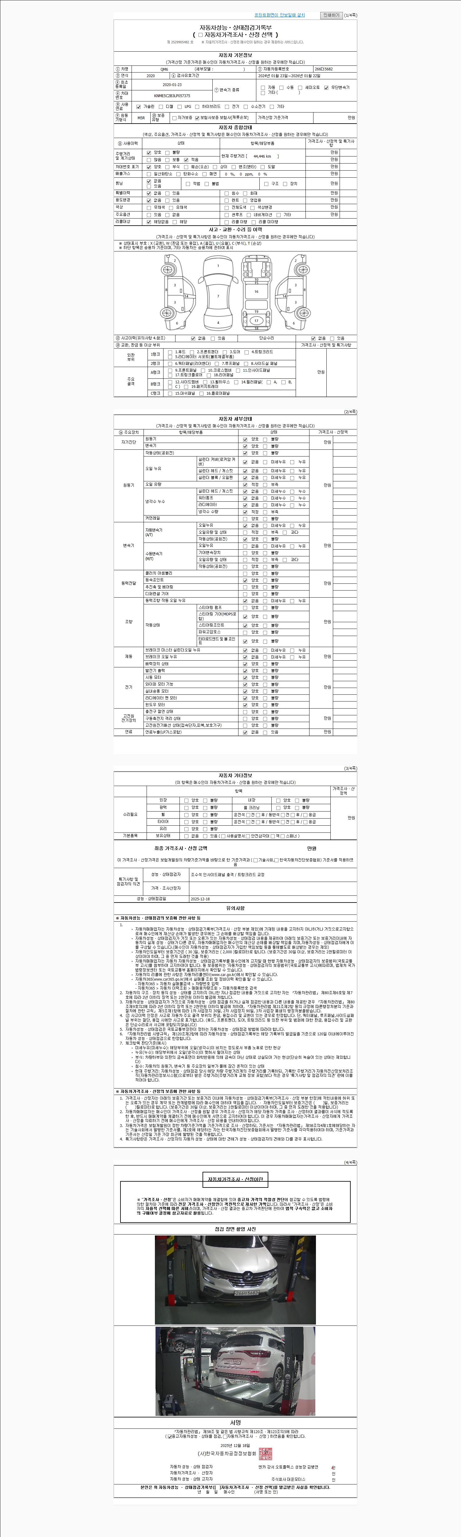 | 주행거리 | 44,445 km | 차량번호 | 266더5682 | 사고유무 | 성능기록부 참조 | 제시번호 | 제 2025172365 호 |