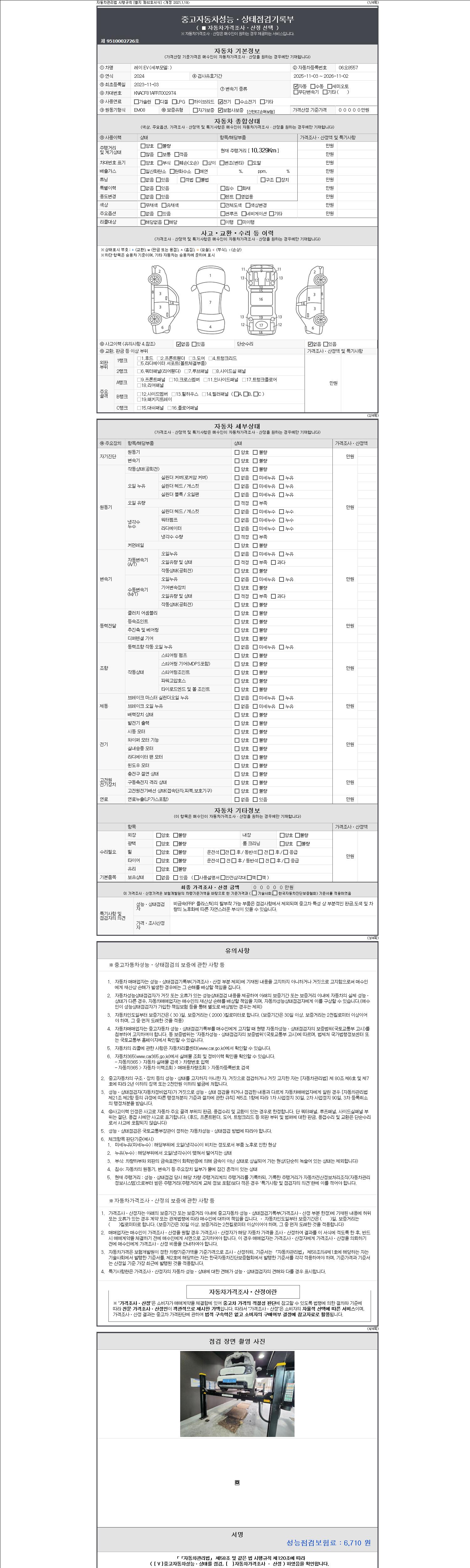 자동차관리법 시행규칙 제120조의 규정에 따라 별지 제 82호서식 《중고자동차 성능, 상태점검 기록부》를 발행한 성능, 상태점검자 및 매매자는 아래의 보증기간 또는 보증거리 이내의 중고자동차, 성능점검 기록부에 기재된 내용과 자동차의 실제 성능, 상태가 다른 경우 계약 또는 관계법령에 따라 매수인에 대하여 책임을 집니다.