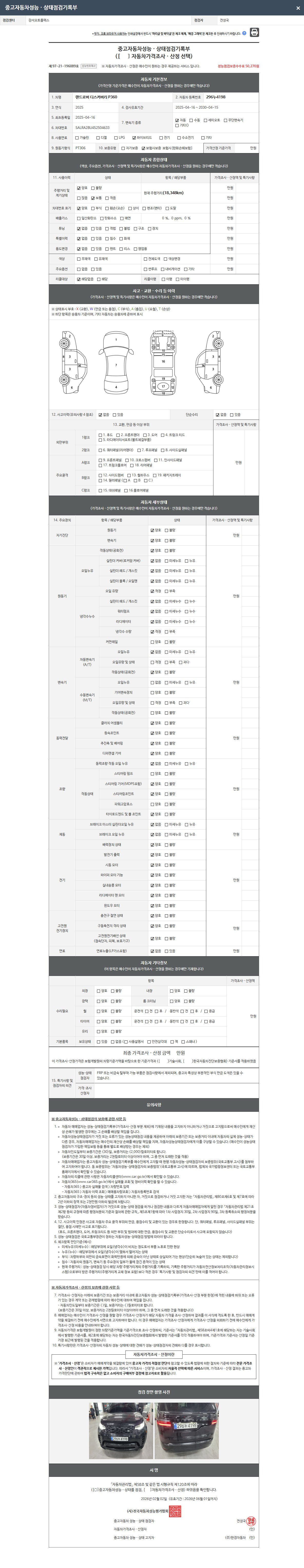 - 2. 차량 등록증이나 성능점검지 등을 상담자에게 요청및 확인하시고 사전에 미리 점검 하시기를 권유드립니다.