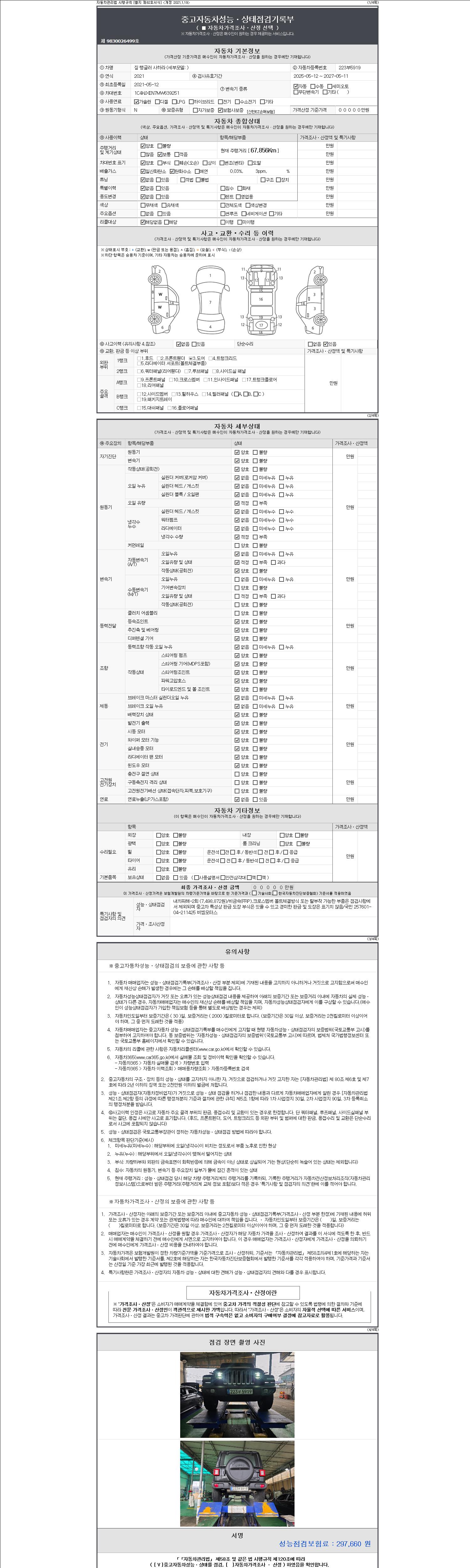 자동차관리법 시행규칙 제120조의 규정에 따라 별지 제 82호서식 《중고자동차 성능, 상태점검 기록부》를 발행한 성능, 상태점검자 및 매매자는 아래의 보증기간 또는 보증거리 이내의 중고자동차, 성능점검 기록부에 기재된 내용과 자동차의 실제 성능, 상태가 다른 경우 계약 또는 관계법령에 따라 매수인에 대하여 책임을 집니다.