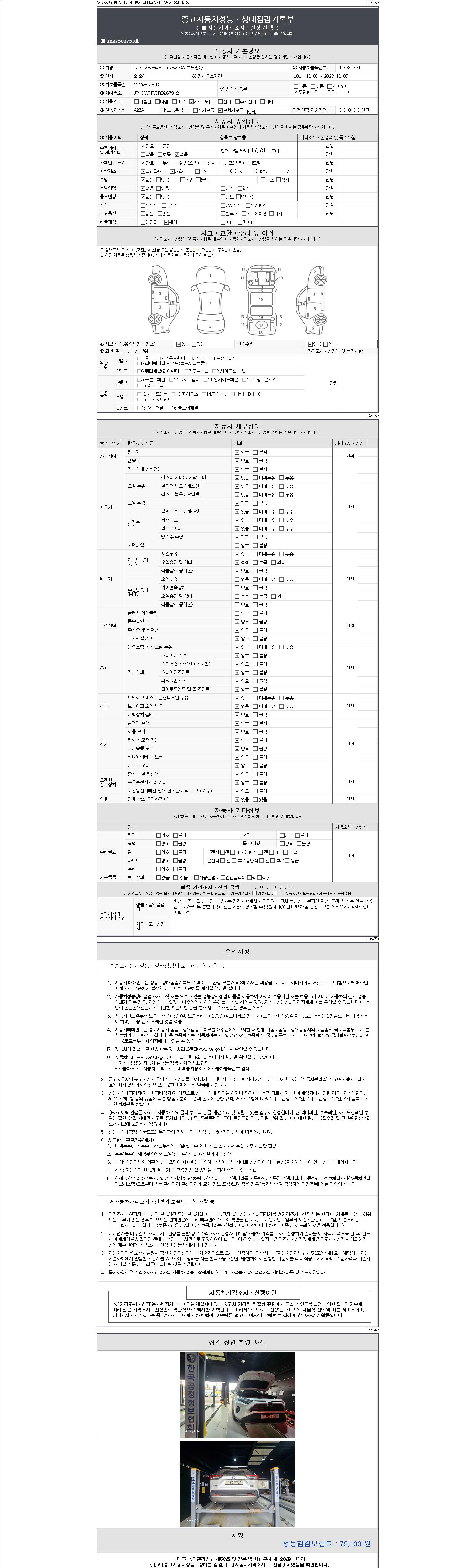 자동차관리법 시행규칙 제120조의 규정에 따라 별지 제 82호서식 《중고자동차 성능, 상태점검 기록부》를 발행한 성능, 상태점검자 및 매매자는 아래의 보증기간 또는 보증거리 이내의 중고자동차, 성능점검 기록부에 기재된 내용과 자동차의 실제 성능, 상태가 다른 경우 계약 또는 관계법령에 따라 매수인에 대하여 책임을 집니다.