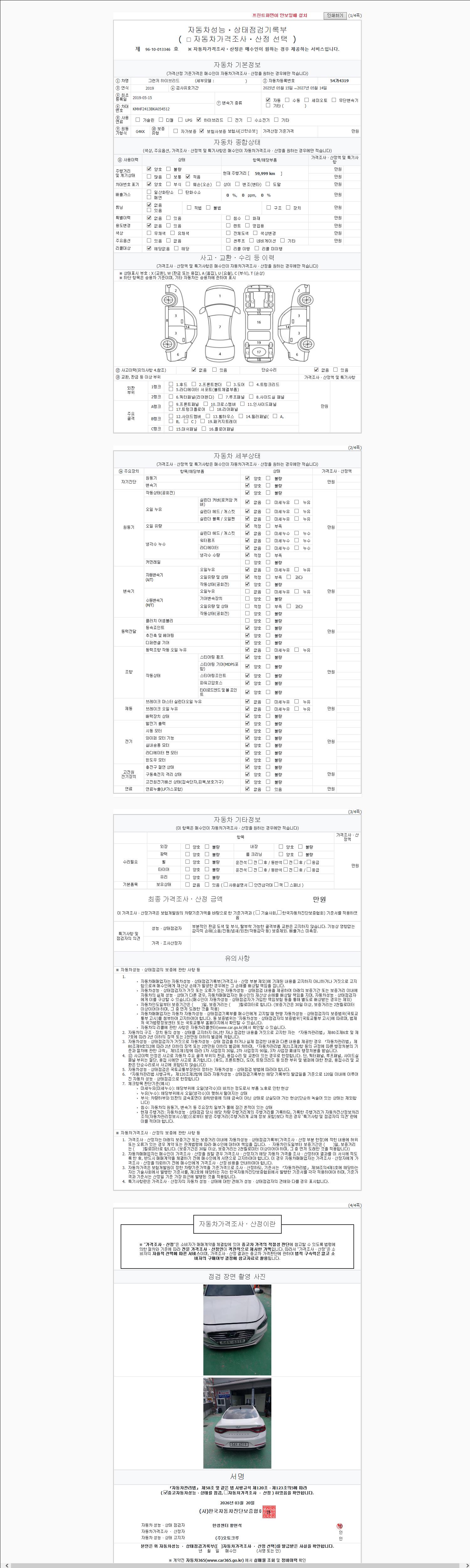 | 주행거리 | 59,999 km | 차량번호 | 54가4319 | 사고유무 | 성능기록부 참조 | 제시번호 | 제 2026009020 호 |